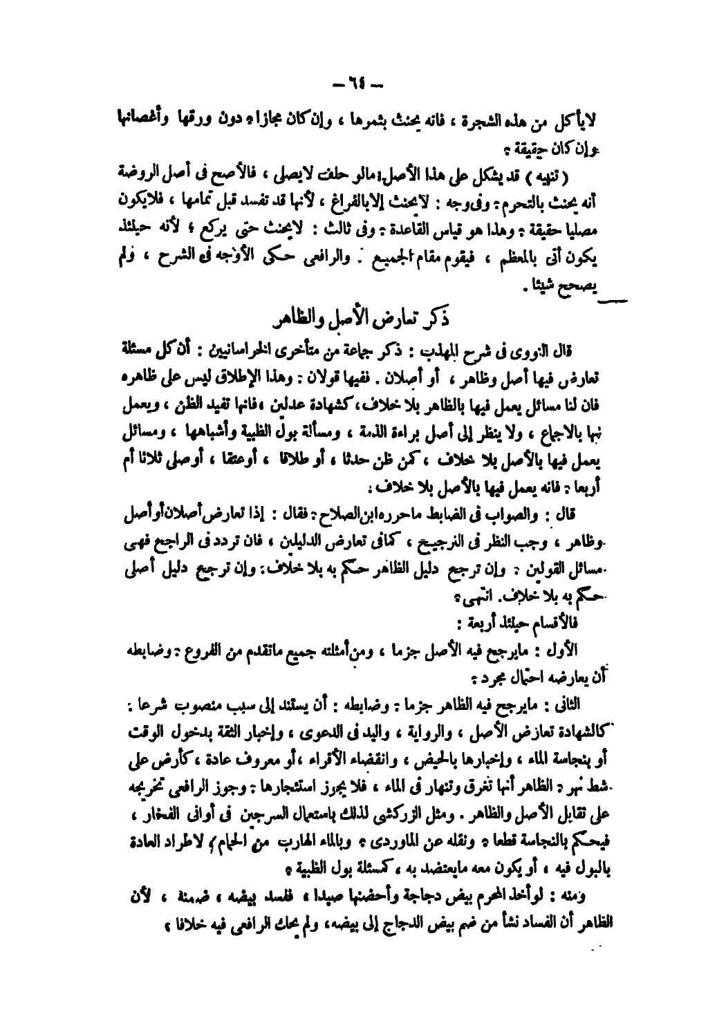قَالَ النَّوَوِيُّ فِي شَرْحِ الْمُهَذَّبِ: ذَكَر جَمَاعَةٌ مِنْ مُتَأَخِّرِي الْخُرَاسَانِيِّينَ: أَنَّ كُلَّ مَسْأَلَةٍ تَعَارَضَ فِيهَا أَصْلٌ وَظَاهِرٌ أَوْ أَصْلَانِ فَفِيهَا قَوْلَانِ، وَهَذَا الْإِطْلَاقُ لَيْسَ عَلَى ظَاهِرِهِ فَإِنَّ لَنَا مَسَائِلُ يُعْمَل فِيهَا بِالظَّاهِرِ بِلَا خِلَافٍ، كَشَهَادَةِ عَدْلَيْنِ، فَإِنَّهَا تُفِيدُ الظَّنَّ، وَيُعْمَل بِهَا بِالْإِجْمَاعِ، وَلَا يُنْظَرُ إلَى أَصْلِ بَرَاءَةِ الذِّمَّةِ، وَمَسْأَلَةُ بَوْلِ الظَّبْيَة وَأَشْبَاهِهَا، وَمَسَائِلُ يُعْمَلُ فِيهَا بِالْأَصْلِ بِلَا خِلَافٍ.