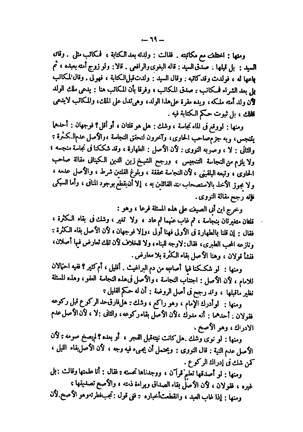 وَمِنْهَا: لَوْ شَكَكْنَا فِيمَا أَصَابَ مِنْ دَم الْبَرَاغِيثِ أَقَلِيلٌ، أَمْ كَثِيرٌ؟ فَفِيهِ احْتِمَالَانِ لِلْإِمَامِ ; لِأَنَّ الْأَصْلَ: اجْتِنَابُ النَّجَاسَةِ، وَالْأَصْلُ فِي هَذِهِ النَّجَاسَةِ الْعَفْوُ، وَهَذِهِ الْمَسْأَلَةُ نَظِيرُ مَا قَبْلَهَا، وَقَدْ رَجَّحَ فِي أَصْلِ الرَّوْضَةِ: أَنَّ لَهُ حُكْمَ الْقَلِيلِ.