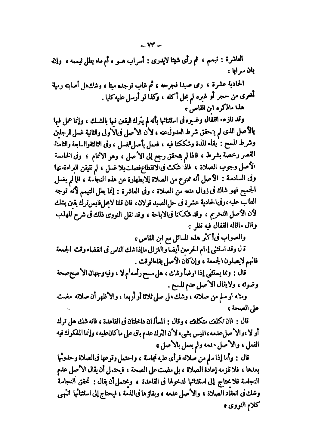 وَفِي السَّادِسَةِ: الْأَصْلُ أَنَّهُ مَمْنُوعٌ مِنْ الصَّلَاةِ إلَّا بِطَهَارَةٍ عَنْ هَذِهِ النَّجَاسَةِ، فَلَمَّا لَمْ يَغْسِلْ الْجَمِيعَ فَهُوَ شَاكٌّ فِي زَوَالِ مَنْعِهِ مِنْ الصَّلَاةِ، وَفِي الْعَاشِرَةِ: إنَّمَا بَطَلَ التَّيَمُّمُ لِأَنَّهُ تَوَجَّهَ الطَّلَبُ عَلَيْهِ، وَفِي الْحَادِيَةِ عَشْرَةَ فِي حِلّ الصَّيْدِ قَوْلَانِ، فَإِنْ قُلْنَا لَا يَحِلُّ فَلَيْسَ تَرْكَ يَقِينٍ بِشَكٍّ لِأَنَّ الْأَصْلَ التَّحْرِيمُ، وَقَدْ شَكَكْنَا فِي الْإِبَاحَةِ، وَقَدْ نَقَلَ النَّوَوِيُّ ذَلِكَ فِي شَرْحِ الْمُهَذَّبِ وَقَالَ مَا قَالَهُ الْقَفَّالُ فِيهِ نَظَرٌ وَالصَّوَابُ فِي أَكْثَر هَذِهِ الْمَسَائِل مَعَ ابْنِ الْقَاصِّ.