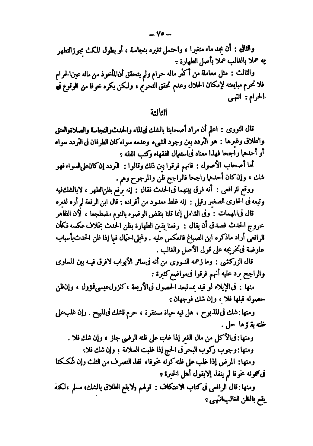 الثَّالِثَةُ: قَالَ النَّوَوِيُّ: اعْلَمْ أَنَّ مُرَادَ أَصْحَابنَا بِالشَّكِّ فِي الْمَاءِ وَالْحَدَثِ وَالنَّجَاسَةِ وَالصَّلَاةِ وَالْعِتْقِ وَالطَّلَاقِ وَغَيْرِهَا: هُوَ التَّرَدُّدُ بَيْن وُجُودِ الشَّيْءِ وَعَدَمِهِ، سَوَاءُ كَانَ الطَّرَفَانِ فِي التَّرَدُّدِ سَوَاءً أَوْ أَحَدُهُمَا رَاجِحًا فَهَذَا مَعْنَاهُ فِي اسْتِعْمَالِ الْفُقَهَاءِ وَكُتُبِ الْفِقْهِ.