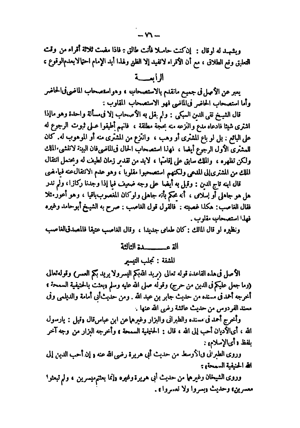 الْقَاعِدَةُ الثَّالِثَةُ الْمَشَقَّةُ: تَجْلِبُ التَّيْسِيرَ الْأَصْلُ فِي هَذِهِ الْقَاعِدَةِ قَوْله تَعَالَى {يُرِيدُ اللَّهُ بِكُمْ الْيُسْرَ وَلَا يُرِيدُ بِكُمْ الْعُسْرَ} [البقرة: ١٨٥] وقَوْله تَعَالَى {وَمَا جَعَلَ عَلَيْكُمْ فِي الدِّينِ مِنْ حَرَجٍ} [الحج: ٧٨] وَقَوْلُهُ صَلَّى اللَّهُ عَلَيْهِ وَسَلَّمَ «بُعِثْتُ بِالْحَنِيفِيَّةِ السَّمْحَةِ» أَخْرَجَهُ أَحْمَدُ فِي مُسْنَدِهِ مِنْ حَدِيثِ جَابِرِ بْنِ عَبْدِ اللَّهِ، وَمِنْ حَدِيثِ أَبِي أُمَامَةَ وَالدَّيْلَمِيِّ، وَفِي مُسْنَدِ الْفِرْدَوْسِ مِنْ حَدِيثِ عَائِشَةَ رَضِيَ اللَّهُ عَنْهَا.