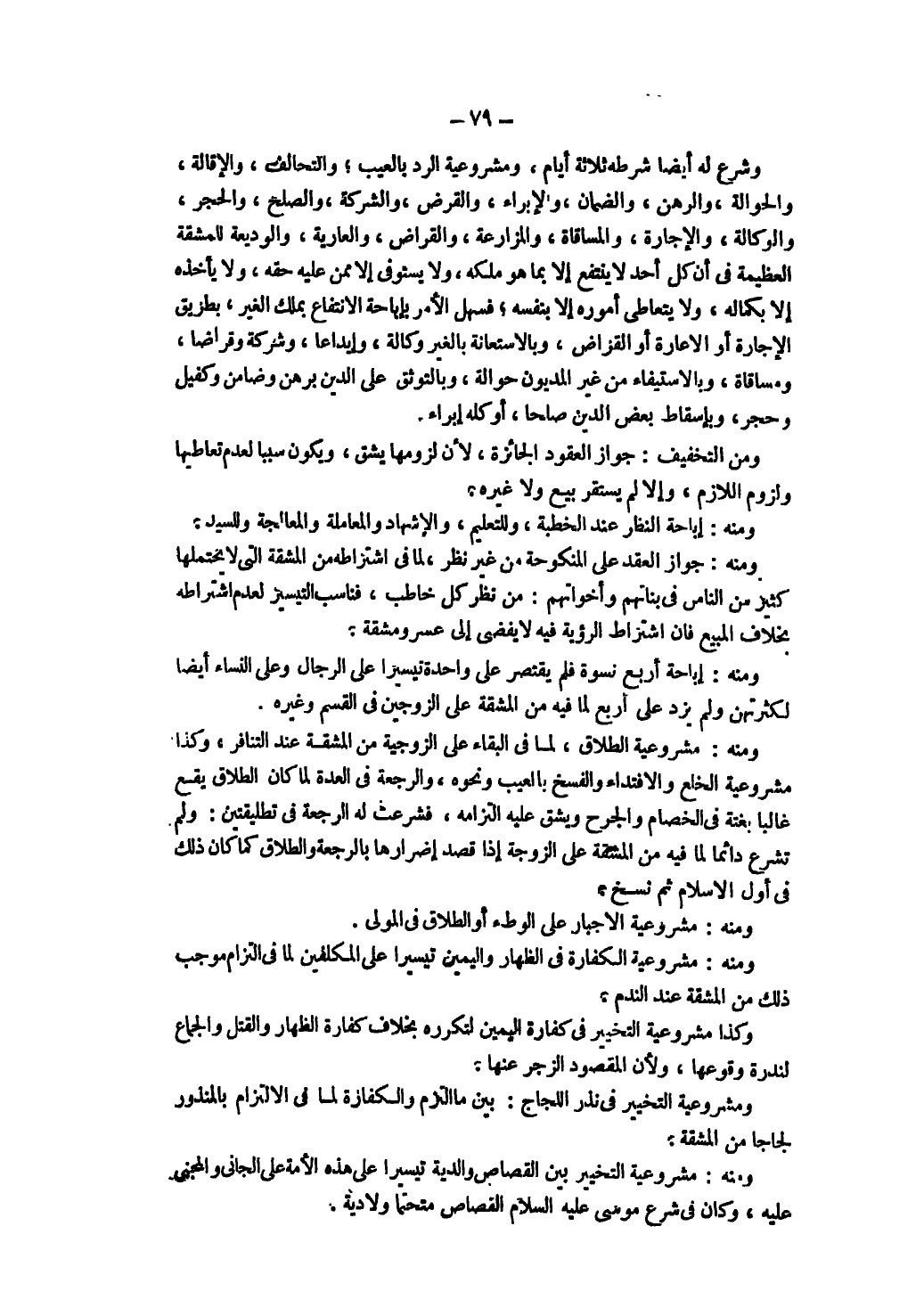 وَمِنْهُ: مَشْرُوعِيَّةُ الطَّلَاقِ، لِمَا فِي الْبَقَاءِ عَلَى الزَّوْجِيَّةِ مِنْ الْمَشَقَّة عِنْدَ التَّنَافُرِ، وَكَذَا مَشْرُوعِيَّةُ الْخُلْعِ وَالِافْتِدَاءِ وَالْفَسْخِ بِالْعَيْبِ وَنَحْوِهِ، وَالرَّجْعَةِ فِي الْعِدَّةِ لَمَّا كَانَ الطَّلَاقُ يَقَعُ غَالِبًا بَغْتَةً فِي الْخِصَامِ وَالْجَرْح وَيَشُقُّ عَلَيْهِ الْتِزَامُهُ فَشُرِعَتْ لَهُ الرَّجْعَةُ فِي تَطْلِيقَتَيْنِ: وَلَمْ تُشْرَعْ دَائِمًا لِمَا فِيهِ مِنْ الْمَشَقَّةِ عَلَى الزَّوْجَةِ إذَا قُصِدَ إضْرَارُهَا بِالرَّجْعَةِ وَالطَّلَاقِ كَمَا كَانَ ذَلِكَ فِي أَوَّلِ الْإِسْلَامِ ثُمَّ نُسِخَ.