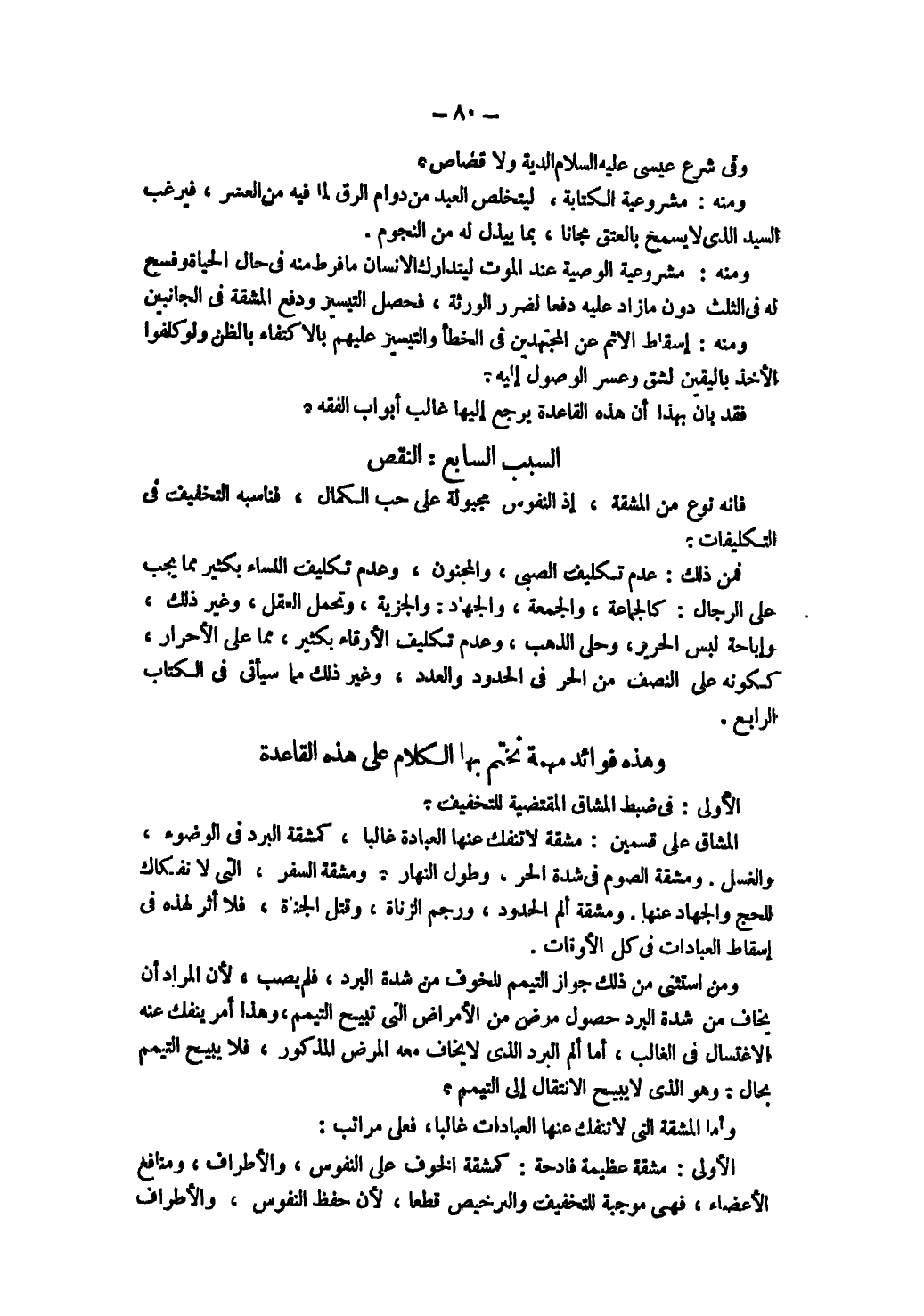 فَمِنْ ذَلِكَ: عَدَمُ تَكْلِيفِ الصَّبِيِّ، وَالْمَجْنُونِ، وَعَدَمُ تَكْلِيفِ النِّسَاءِ بِكَثِيرٍ مِمَّا يَجِبُ عَلَى الرِّجَالِ: كَالْجَمَاعَةِ، وَالْجُمُعَةِ، وَالْجِهَادِ وَالْجِزْيَةِ، وَتَحَمُّلِ الْعَقْلِ، وَغَيْرِ ذَلِكَ وَإِبَاحَةِ لُبْسِ الْحَرِيرِ، وَحِلِّ الذَّهَبِ، وَعَدَمُ تَكْلِيفِ الْأَرِقَّاءِ بِكَثِيرٍ، مِمَّا عَلَى الْأَحْرَارِ، كَكَوْنِهِ عَلَى النِّصْفِ مِنْ الْحُرِّ فِي الْحُدُودِ وَالْعِدَدِ وَغَيْرِ ذَلِكَ مِمَّا سَيَأْتِي فِي الْكِتَابِ الرَّابِعِ.