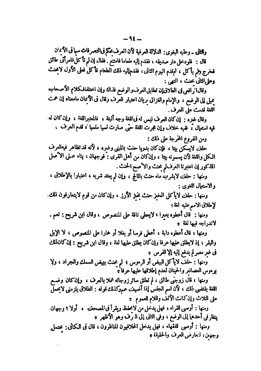 وَالثَّانِي - وَعَلَيْهِ الْبَغَوِيّ -: الدَّلَالَةُ الْعُرْفِيَّةُ لِأَنَّ الْعُرْفَ يَحْكُمُ فِي التَّصَرُّفَاتِ سِيَّمَا فِي الْأَيْمَانِ. قَالَ: فَلَوْ دَخَلَ دَارَ صَدِيقِهِ، فَقَدَّمَ إلَيْهِ طَعَامًا فَامْتَنَعَ. فَقَالَ إنْ لَمْ تَأْكُلْ فَامْرَأَتِي طَالِقٌ فَخَرَجَ وَلَمْ يَأْكُلْ، ثُمَّ قَدِمَ الْيَوْمَ الثَّانِي، فَقَدَّمَ إلَيْهِ ذَلِكَ الطَّعَامَ فَأَكَلَ فَعَلَى الْأَوَّلِ لَا يَحْنَثُ، وَعَلَى الثَّانِي يَحْنَثُ، انْتَهَى.