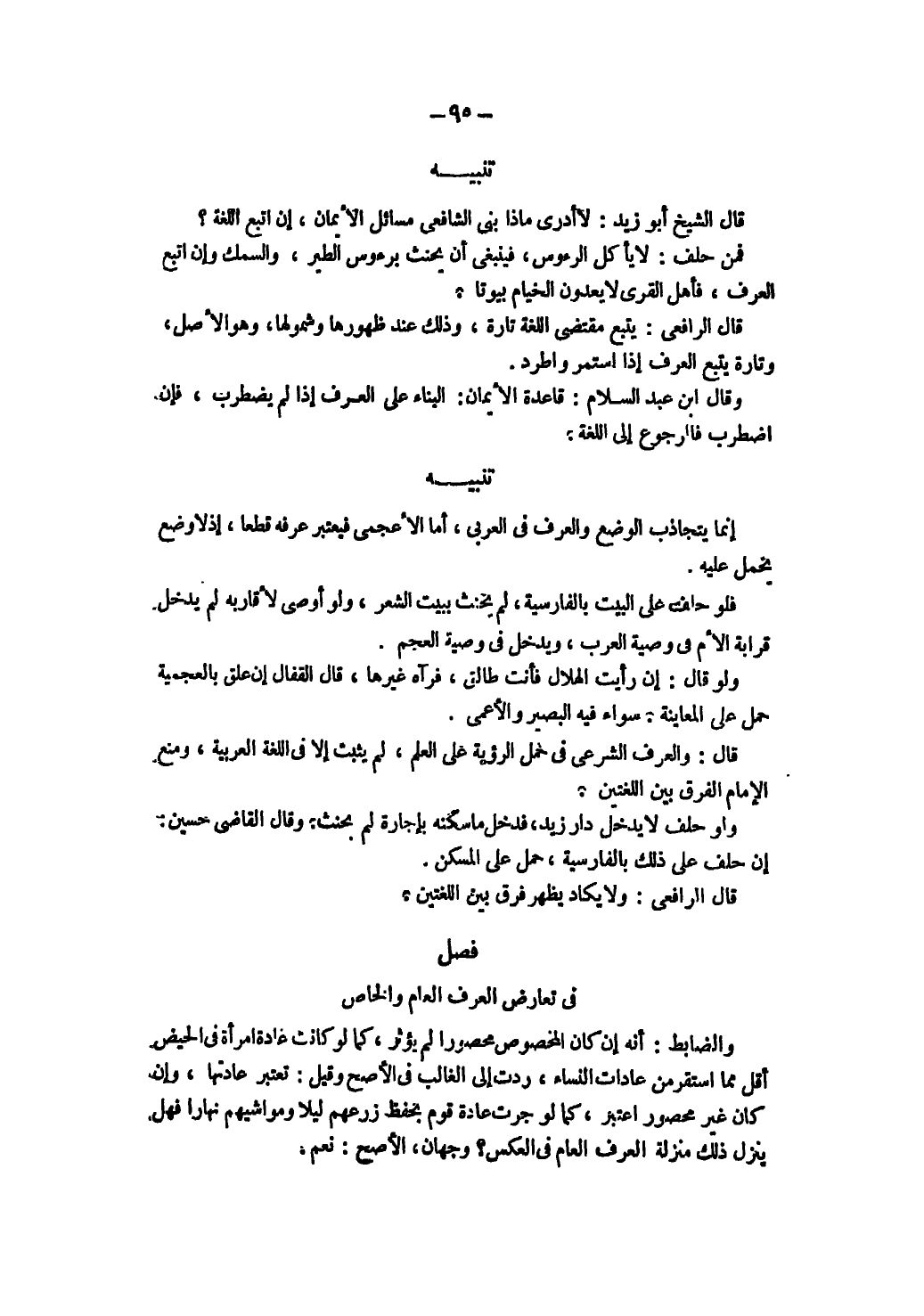 قَالَ الشَّيْخُ أَبُو زَيْدٍ: لَا أَدْرِي مَاذَا بَنَى الشَّافِعِيُّ مَسَائِلَ الْأَيْمَانِ، إنْ اتَّبَعَ اللُّغَةَ؟ فَمَنْ حَلَفَ: لَا يَأْكُل الرُّءُوسَ، فَيَنْبَغِي أَنْ يَحْنَثَ بِرُءُوسِ الطَّيْرِ، وَالسَّمَكِ. وَإِنْ اتَّبَعَ الْعُرْفَ، فَأَهْلُ الْقُرَى لَا يَعُدُّونَ الْخِيَامَ بُيُوتًا.