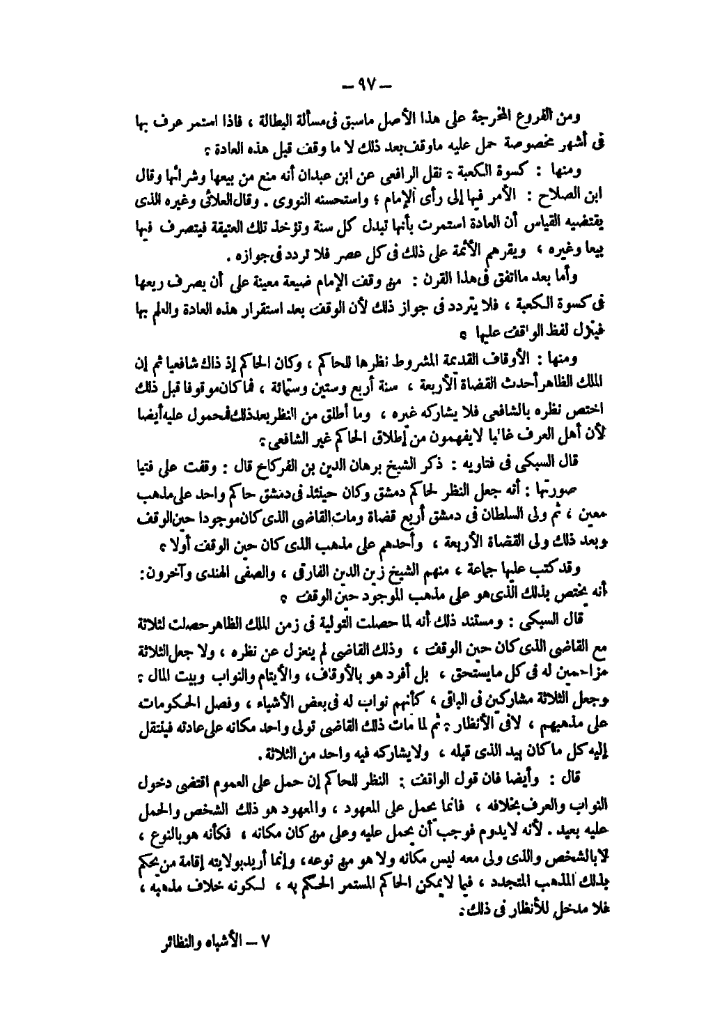 وَمِنْهَا: الْأَوْقَافُ الْقَدِيمَةُ الْمَشْرُوطُ نَظَرُهَا لِلْحَاكِمِ، وَكَانَ الْحَاكِمُ إذْ ذَاكَ شَافِعِيًّا ثُمَّ إنَّ الْمَلِكَ الظَّاهِرَ أَحْدَثَ الْقُضَاةَ الْأَرْبَعَةَ، سَنَةَ أَرْبَعٍ وَسِتِّينَ وَسِتِّمِائَةٍ، فَمَا كَانَ مَوْقُوفًا قَبْلَ ذَلِكَ اخْتَصَّ نَظَرُهُ بِالشَّافِعِيِّ فَلَا يُشَارِكُهُ غَيْرُهُ، وَمَا أُطْلِقَ مِنْ النَّظَرِ بَعْد ذَلِكَ فَمَحْمُولٌ عَلَيْهِ أَيْضًا لِأَنَّ أَهْلَ الْعُرْفِ غَالِبًا لَا يَفْهَمُونَ مِنْ إطْلَاقِ الْحَاكِم غَيْرِ الشَّافِعِيِّ.