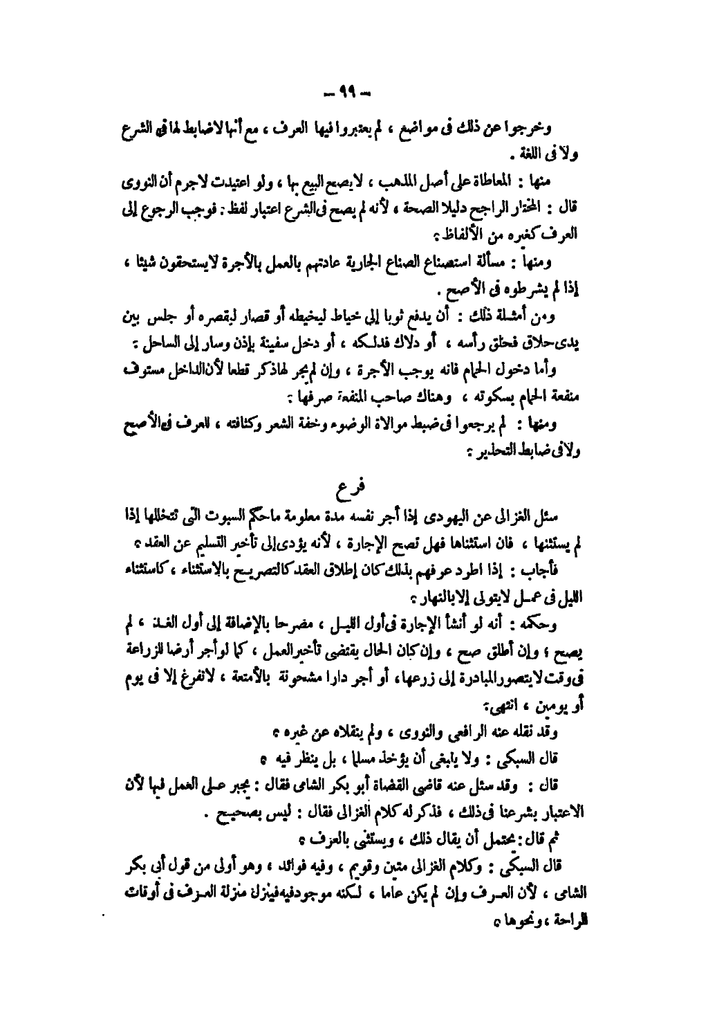 سُئِلَ الْغَزَالِيُّ عَنْ الْيَهُودِيِّ إذَا أَجَّرَ نَفْسَهُ مُدَّةً مَعْلُومَةً مَا حُكْمُ السُّبُوتِ الَّتِي تَتَخَلَّلهَا إذَا لَمْ يَسْتَثْنِهَا فَإِنْ اسْتَثْنَاهَا فَهَلْ تَصِحُّ الْإِجَارَةُ لِأَنَّهُ يُؤَدِّي إلَى تَأْخِيرِ التَّسْلِيمِ عَنْ الْعَقْدِ، فَأَجَابَ: إذَا اطَّرَدَ عُرْفُهُمْ بِذَلِكَ كَانَ إطْلَاقُ الْعَقْدِ كَالتَّصْرِيحِ بِالِاسْتِثْنَاءِ، كَاسْتِثْنَاءِ اللَّيْلِ فِي عَمَلٍ لَا يُتَوَلَّى إلَّا بِالنَّهَارِ.