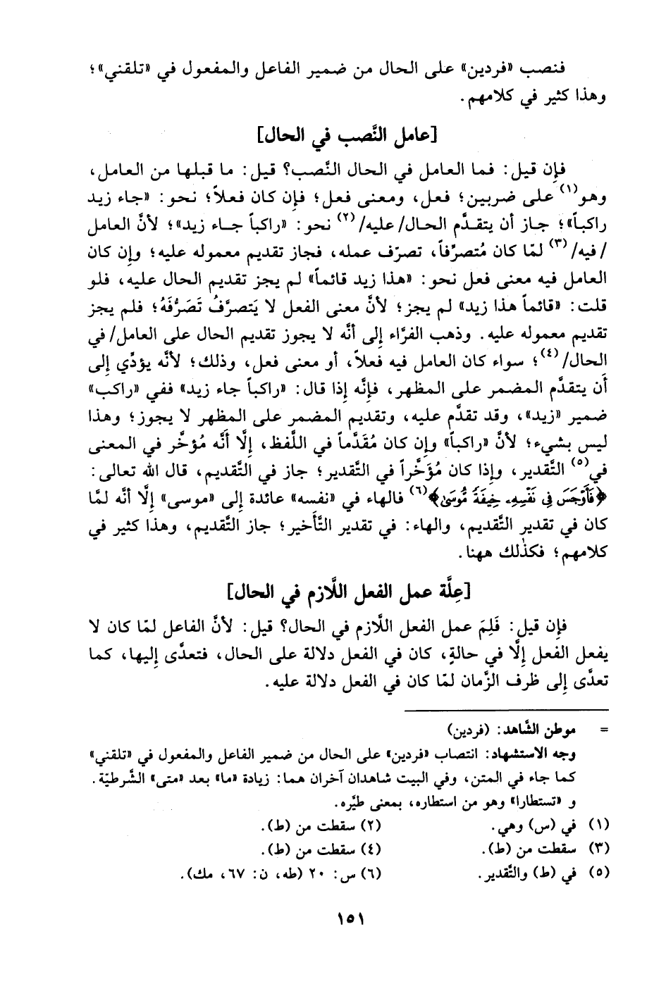 فإن قيل: فَلِمَ عمل الفعل اللازم في الحال؟ قيل: لأن الفاعل لَمّا كان لا يفعل الفعل إلا في حالةٍ، كان في الفعل دلالة على الحال، فتعدَّى إليها، كما تعدَّى إلى ظرف الزمان لَمّا كان في الفعل دلالة عليه.