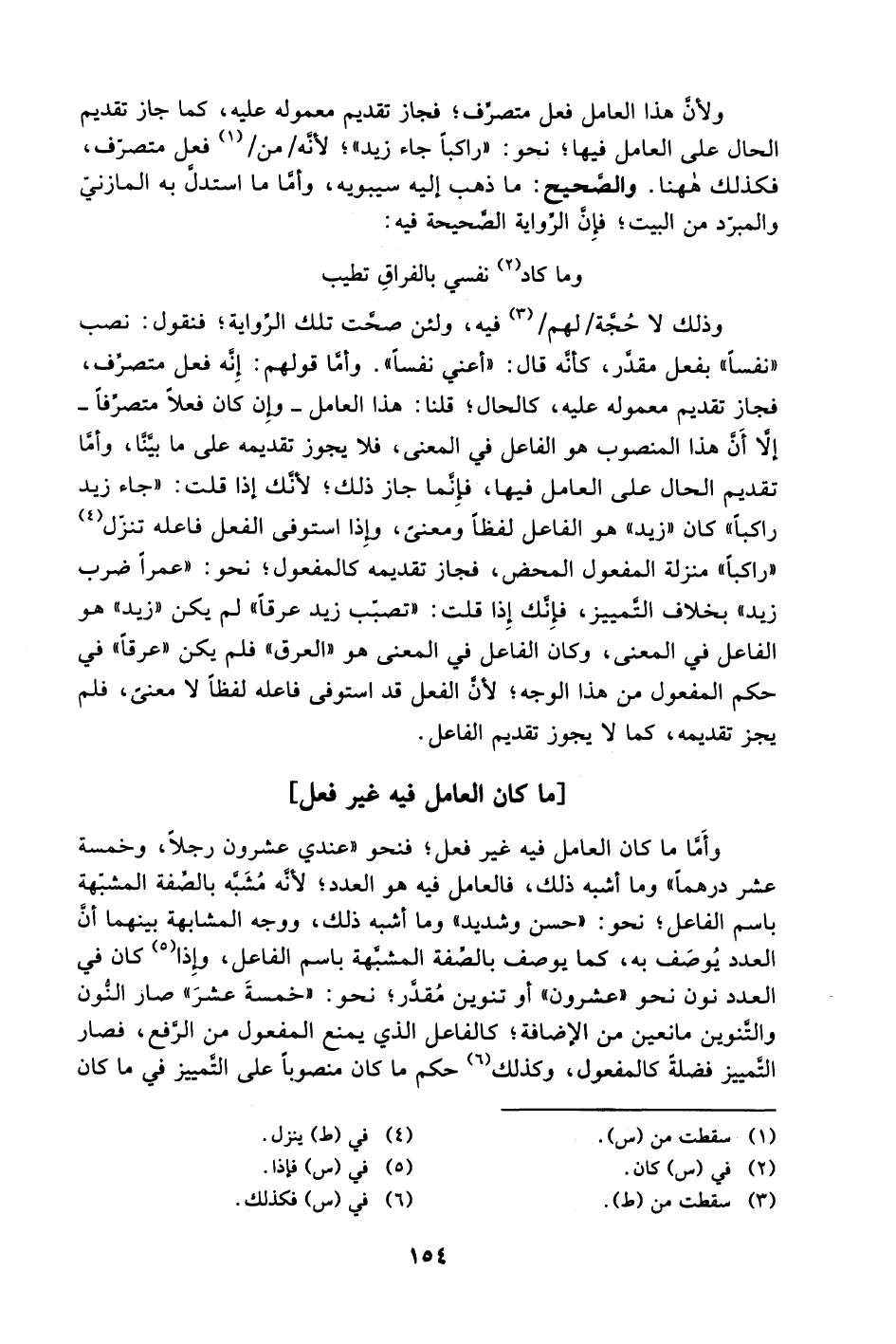 وأما ما كان العامل فيه غير فعل؛ فنحو: "عندي عشرون رجلاً، وخمسة عشر درهمًا" وما أشبه ذلك، فالعامل فيه هو العدد؛ لأنه مُشبه بالصفة المشبّهة باسم الفاعل؛ نحو: "حسن وشديد" وما أشبه ذلك، ووجه المشابهة بينهما أن العدد يُوصَف به، كما يوصف بالصفة المشبهة باسم الفاعل، وإذا5 كان في العدد نون نحو: "عشرون" أو تنوين مُقدر؛ نحو: "خمسةَ عشرَ" صار النون والتنوين مانعين من الإضافة؛ كالفاعل الذي يمنع المفعول من الرفع، فصار التمييز فضلةً كالمفعول، وكذلك6 حكم ما كان منصوبًا على التمييز في ما كان