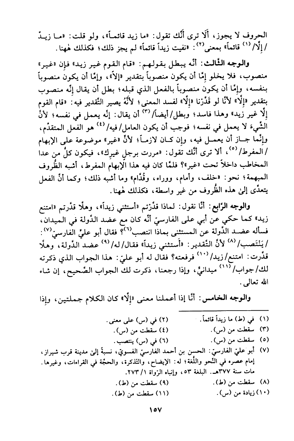 والوجه الرابع: أنَّا نقول: لماذا قدَّرتم "أستثني زيدًا"، وهلا قدَّرتم "امتنع زيد" كما حكي عن أبي على الفارسي أنه كان مع عضد الدولة في الميدان، فسأله عضد الدولة عن المستثنى بماذا انتصب 6؟ فقال أبو علي الفارسي7:/ينتصب/8 لأن التقدير: "أستثني زيدًا" فقال /له/9 عضد الدولة، وهلا قدرت: امتنع/زيد/ 10 فرفعته؟ فقال له أبو علي: هذا الجواب الذي ذكرته لك / جواب/ 11 ميداني، وإذا رجعنا، ذكرت لك الجواب الصحيح، إن شاء الله تعالى.