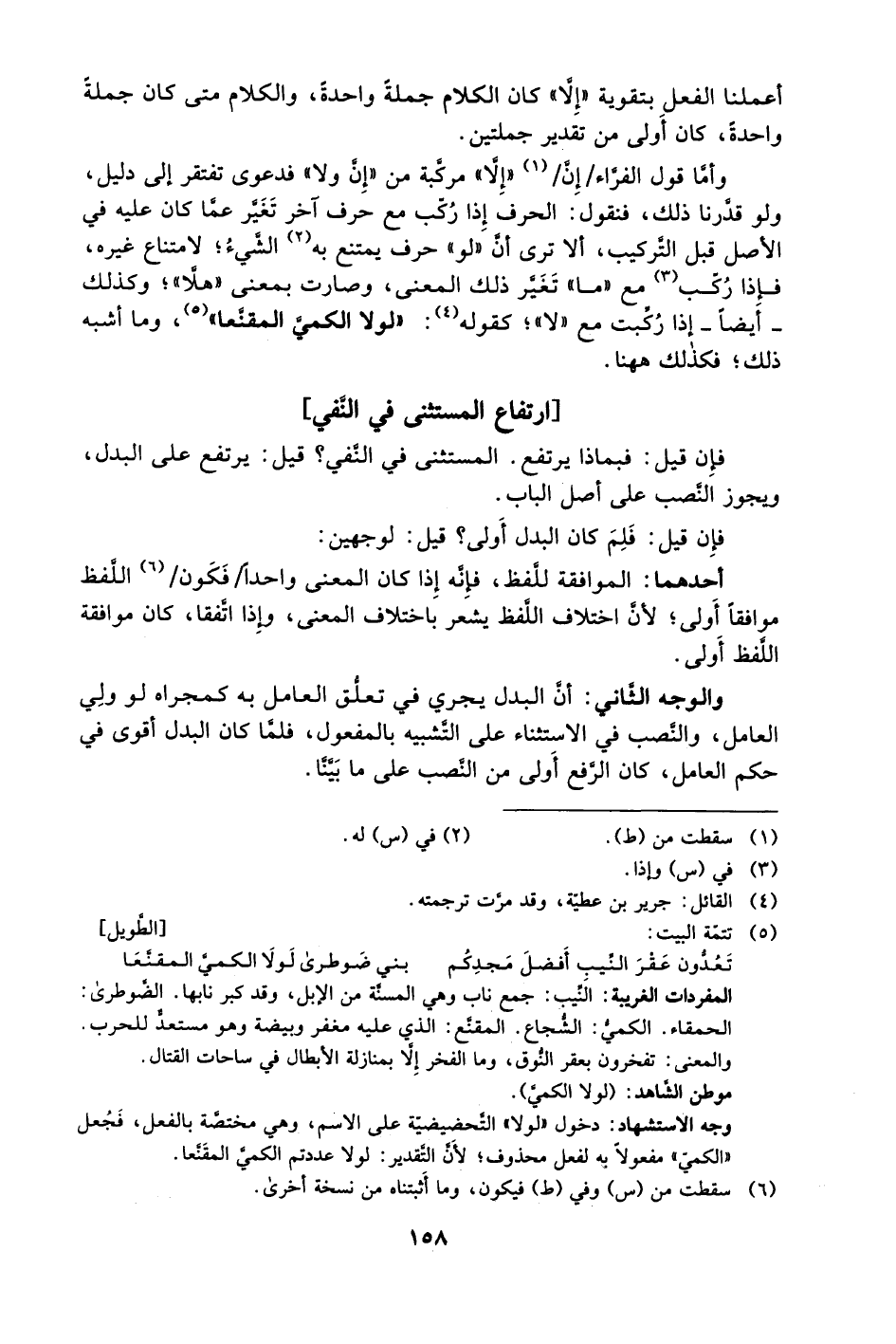 وأما قول الفراء /إنَّ/1 "إلا" مركبة من "إنَّ ولا" فدعوى تفتقر إلى دليل، ولو قدرنا ذلك، فنقول: الحرف إذا رُكب مع حرف آخر تغيَّر عما كان عليه في الأصل قبل التركيب، ألا ترى أن "لو" حرف يمتنع به 2 الشيءُ؛ لامتناع غيره، فإذا رُكّب3 مع "ما" تغير ذلك المعنى، وصارت بمعنى "هلَّا"؛ وكذلك -أيضًا- إذا رُكبت مع "لا"؛ كقوله4: "لولا الكميَّ المقنَّعا"5، وما أشبه ذلك؛ فكذلك ههنا.