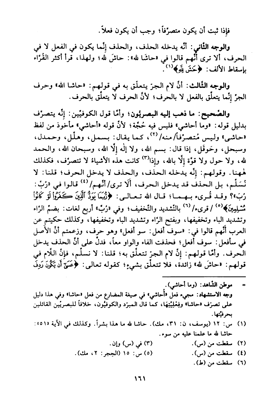 والصحيح: ما ذهب إليه البصريون؛ وأما قول الكوفيين: إنه يتصرف بدليل قوله: "وما أحاشي" فليس فيه حُجة؛ لأن قوله "أحاشي" مأخوذ من لفظ "حاشى" وليس مُتصرفًا/منه/2، كما يقال: بسمل، وهلل، وحمدل، وسبحل، وحَوقَل، إذا قال: بسم الله، ولا إله إلا الله، وسبحان الله، والحمد لله، ولا حول ولا قوة إلا بالله، وإذا3 كانت هذه الأشياءُ لا تتصرف، فكذلك ههنا. وقولهم: إنه يدخله الحذف، والحذف لا يدخل الحرف؛ قلنا: لا نُسلِّم، بل الحذف قد يدخل الحرف، ألا ترى/ أنهم/4 قالوا في رُبَّ: رُبَ؟ وقد قُرئ بهما؛ قال الله تعالى: {رُبَمَا يَوَدُّ الَّذِينَ كَفَرُوا لَوْ كَانُوا مُسْلِمِينَ} 5 /قرئ/6 بالتشديد والتخفيف؛ وفي "رُبَّ" أربع لغات: بضم الراء وتشديد الباء وتخفيفها، وبفتح الراء وتشديد الباء وتخفيفها، وكذلك حكيتم عن العرب أنهم قالوا في: "سوف أفعل: سو أفعل" وهو حرف، وزعمتم أن الأصل في سأفعل: سوف أفعل؛ فحذفت الفاء والواو معًا، فدل على أن الحذف يدخل الحرف، وأما قولهم: إن لام الجر تتعلق به؛ قلنا: لا نُسلِّم، فإن اللام في قولهم: "حاشَ لله" زائدة، فلا تتعلق بشيءٍ؛ كقوله تعالى: {عَسَى أَنْ يَكُونَ رَدِفَ