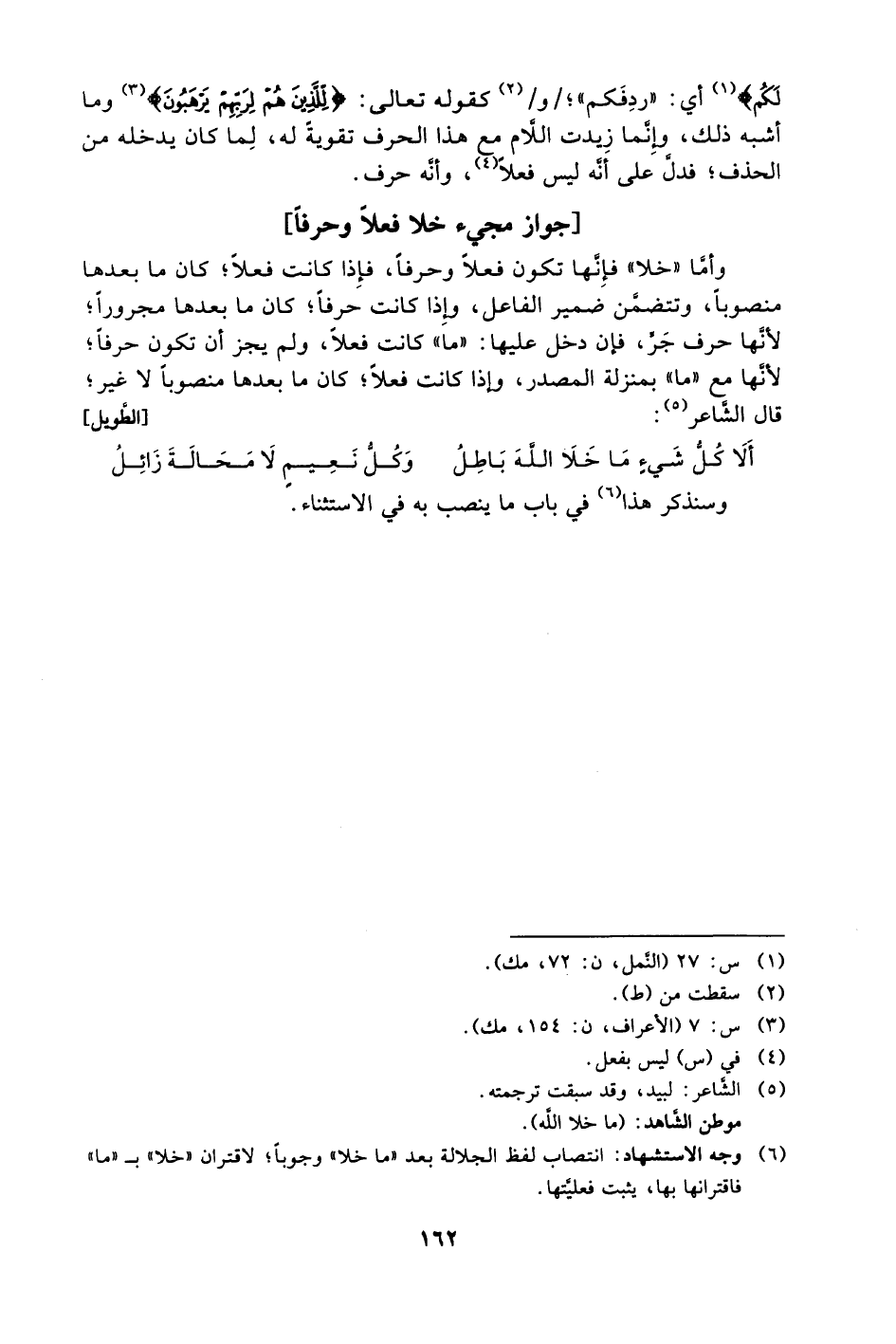 6 وجه الاستشهاد: انتصاب لفظ الجلالة بعد "ما خلا" وجوبًا؛ لاقتران "خلا" بـ "ما" فاقترانها بها، يثبت فعليتها.
