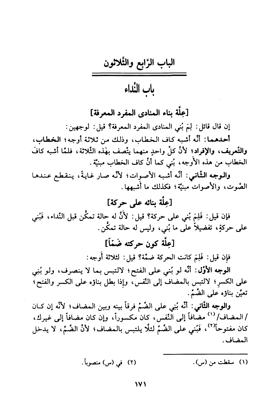 إن قال قائل: لِمَ بُني المنادى المفرد المعرفة؟ قيل: لوجهين: