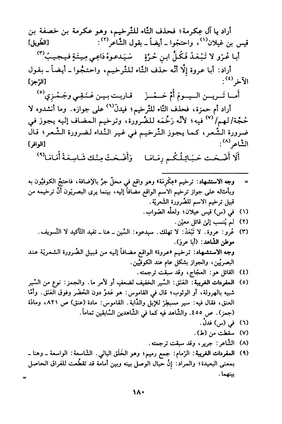 أراد يا آل عكرمة؛ فحذف التاء للترخيم، وهو عكرمة بن خصفة بن قيس غيلان1، واحتجّوا -أيضًا- بقول الشاعر2: [الطويل]