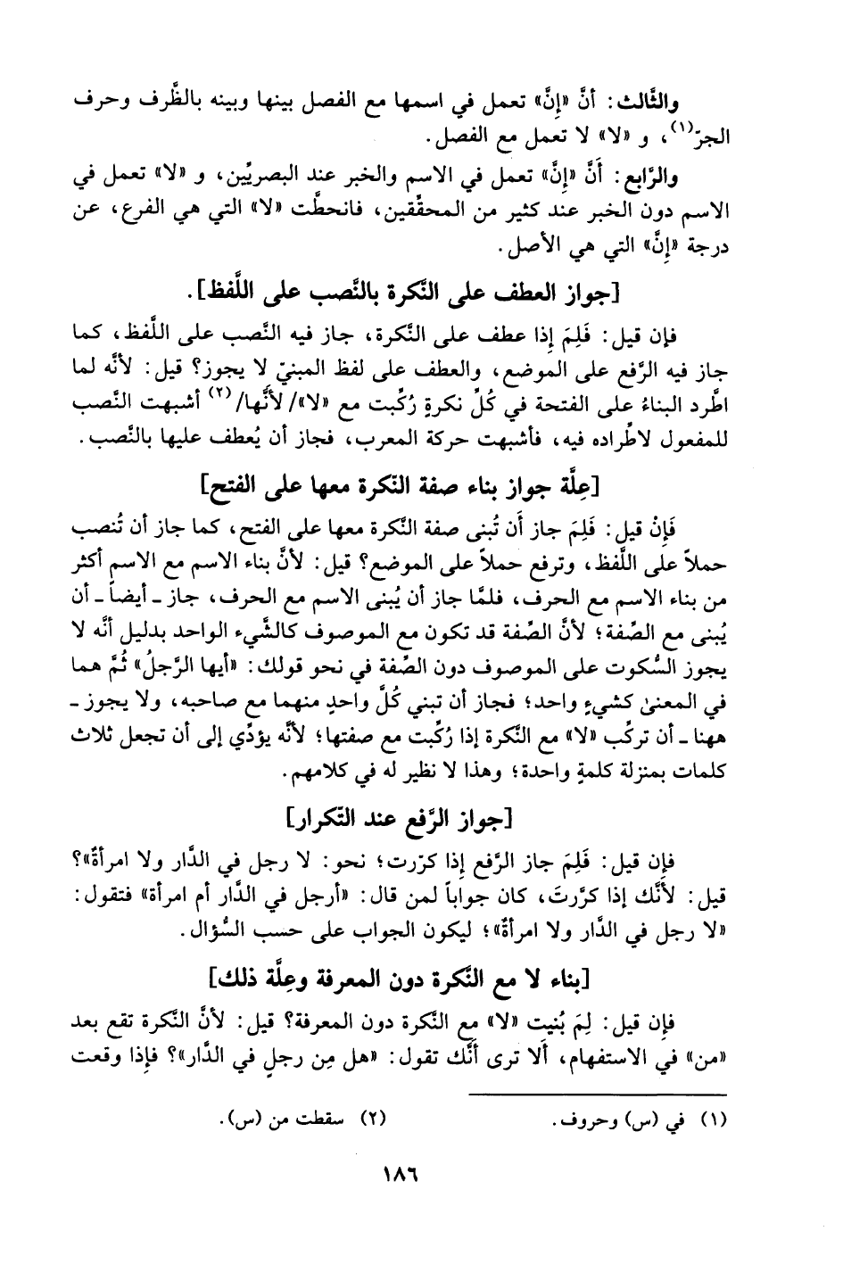 فإن قيل: فَلِمَ جاز أن تُبنى صفة النكرة معها على الفتح، كما جاز أن تُنصب حملاً على اللفظ، وترفع حملاً على الموضع؟ قيل: لأنَّ بناء الاسم مع الاسم أكثر من بناء الاسم مع الحرف، فلمّا جاز أن يُبنى الاسم مع الحرف، جاز -أيضًا- أن يُبنى مع الصفة؛ لأنَّ الصفة قد تكون مع الموصوف كالشيء الواحد بدليل أنَّه لا يجوز السكوت على الموصوف دون الصفة في نحو قولك: "أيها الرجلُ" ثم هما في المعنى كشيءٍ واحد؛ فجاز أن تبني كل واحدٍ منهما مع صاحبه، ولا يجوز -ههنا- أن تركِّب "لا" مع النكرة إذا رُكِّبت مع صفتها؛ لأنه يؤدي إلى أن تجعل ثلاث كلمات بمنزلة كلمةٍ واحدة؛ وهذا لا نظير له في كلامهم.