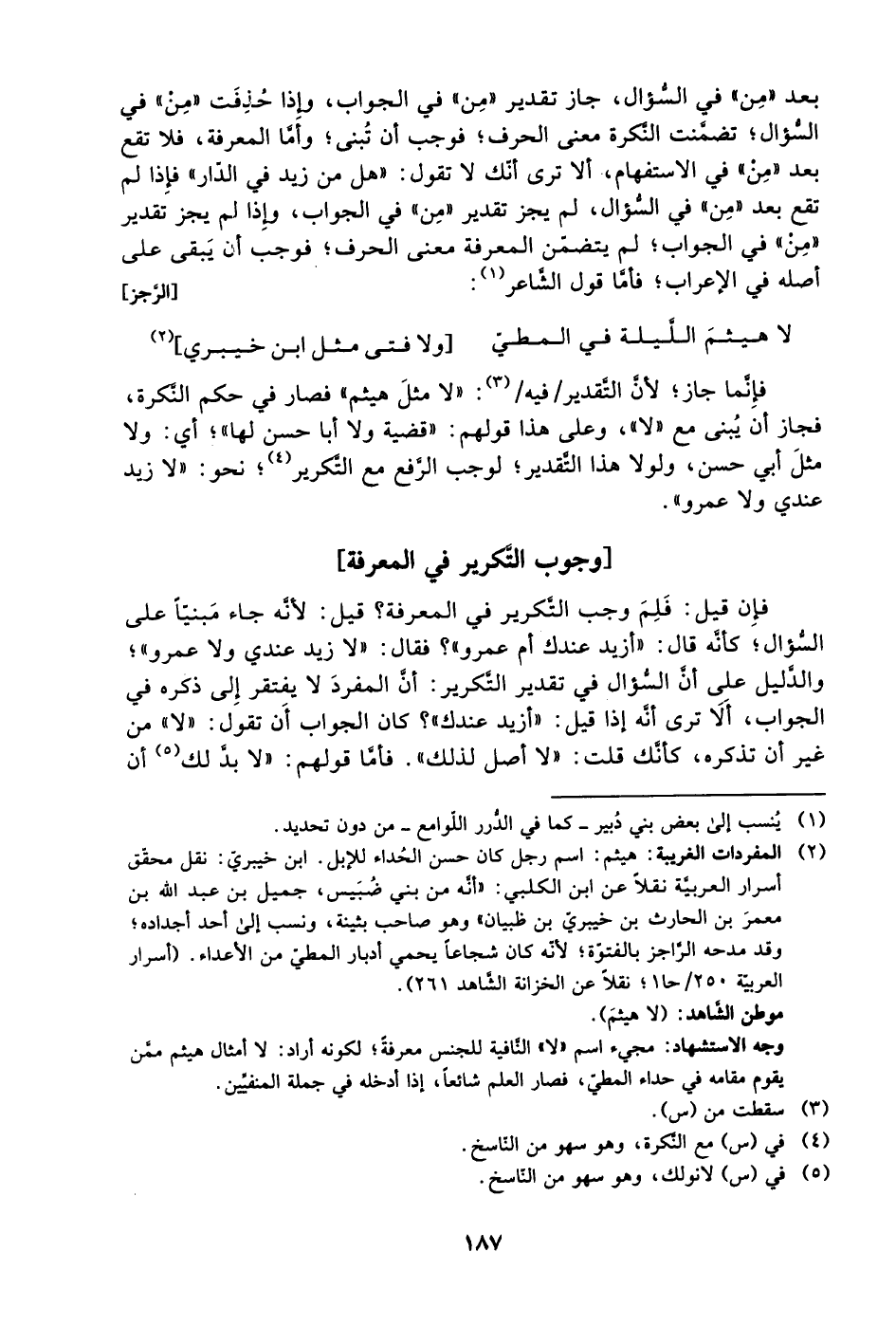 وجه الاستشهاد: مجيء اسم "لا" النافية للجنس معرفةً؛ لكونه أراد: لا أمثال هيثم ممن يقوم مقامه في حداء المطي، فصار العلم شائعًا، إذا أدخله في جملة المنفيين.