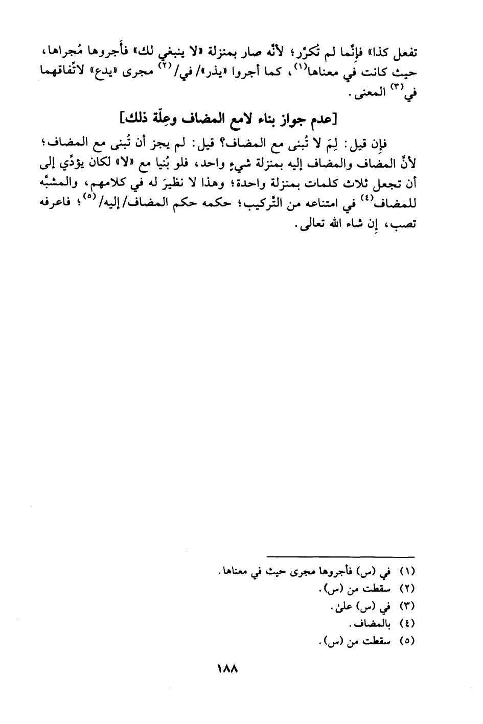 فإن قيل: لِمَ لا تُبنى مع المضاف؟ قيل: لم يجز أن تُبنى مع المضاف؛ لأنَّ المضاف والمضاف إليه بمنزلة شيءٍ واحد، فلو بُنيا مع "لا" لكان يؤدي إلى أن تجعل ثلاث كلمات بمنزلة واحدة؛ وهذا لا نظيرَ له في كلامهم، والمشبَّه للمضاف4 في امتناعه في التركيب؛ حكمه حكم المضاف /إليه/5؛ فاعرفه تصب، إن شاء الله تعالى.
