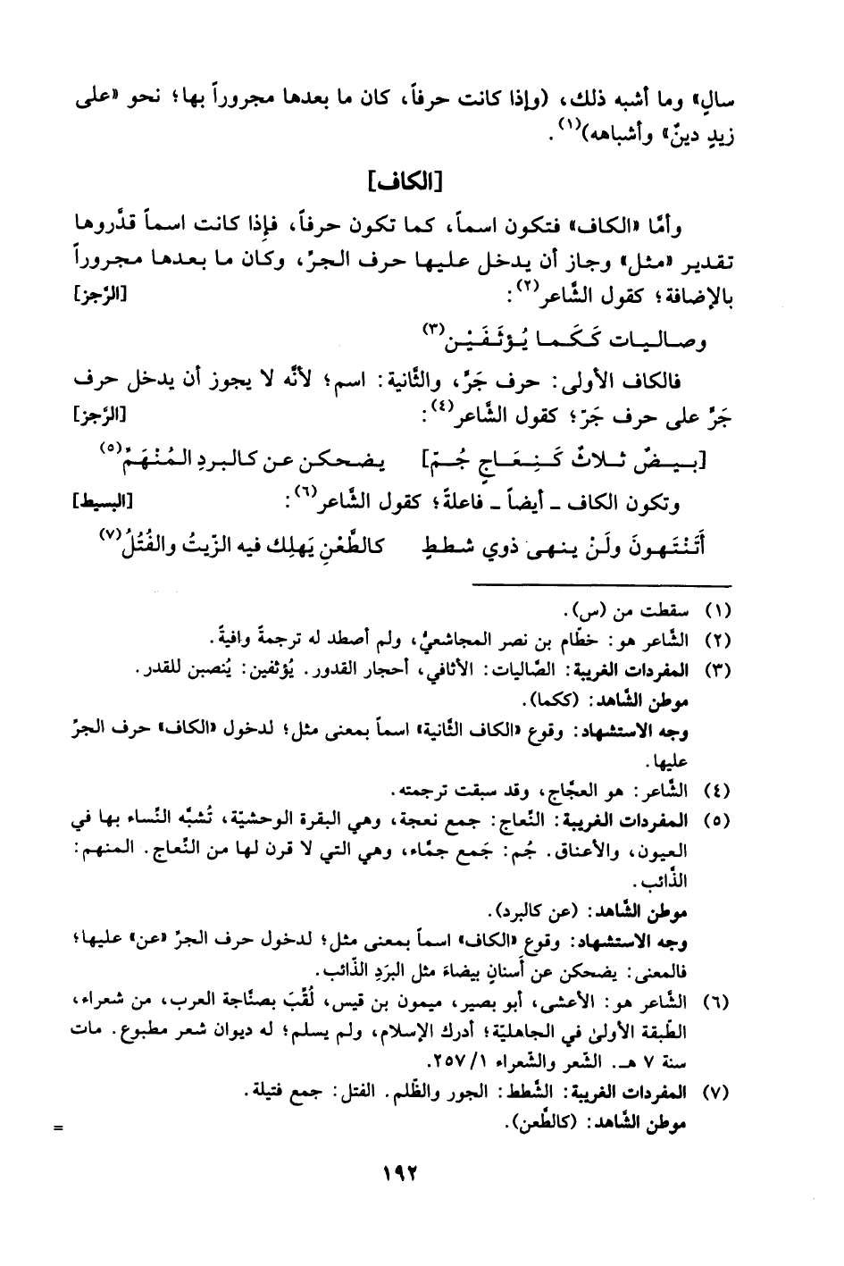 فالكاف الأولى: حرف جَرٍّ، والثانية: اسم؛ لأنه لا يجوز أن يدخل حرف جَرٍّ على حرف جَرٍّ؛ كقول الشاعر4: [الرجز]