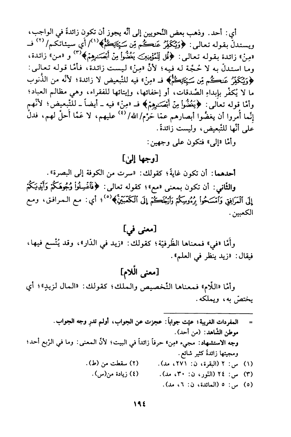 أي: أحد. وذهب بعض النحويين إلى أنه يجوز أن تكون زائدةً في الواجب، ويستدلّ بقوله تعالى: {وَيُكَفِّرُ عَنْكُمْ مِنْ سَيِّئَاتِكُمْ} 1 /أي سيئاتكم/2 فـ"مِنْ" زائدة بقوله تعالى: {قُلْ لِلْمُؤْمِنِينَ يَغُضُّوا مِنْ أَبْصَارِهِمْ} 3 و"مِنْ" زائدة، وما استدل به لا حُجَّة له فيه؛ لأنَّ من ليست زائدة، فأمَّا قوله تعالى: {وَيُكَفِّرُ عَنْكُمْ مِنْ سَيِّئَاتِكُمْ} فـ"مِنْ" فيه للتبعيض لا زائدة؛ لأنه من الذنوب ما لا يُكفَّر بإبداء الصدقات، أو إخفائها، وإيتائها للفقراء، وهي مظالم العباد؛ وأما قوله تعالى: {يَغُضُّوا مِنْ أَبْصَارِهِمْ} فـ"مِنْ" فيه -أيضًا- للتبعيض؛ لأنهم إنما أُمروا أن يغضوا أبصارهم عمَّا حرّم /الله/4 عليهم، لا عمّا أحلَّ لهم، فدل على أنها للتبعيض، وليست زائدةً.