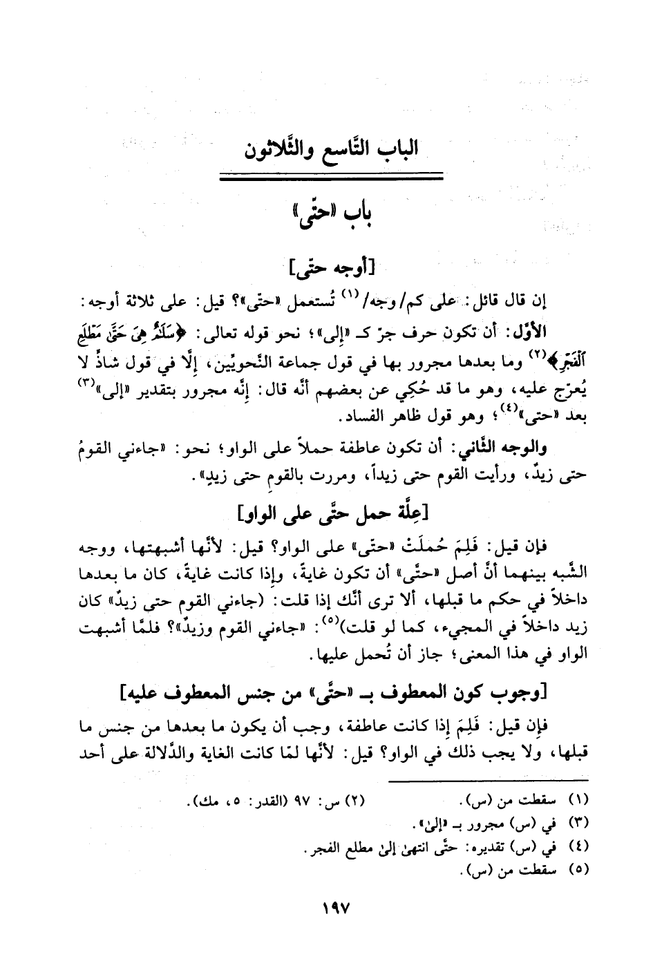 الأوَّل: أن تكون حرف جر كـ"إلى"؛ نحو قوله تعالى: {سَلامٌ هِيَ حَتَّى مَطْلَعِ الْفَجْرِ} 2 وما بعدها مجرور بها في قول جماعة النحويين، إلا في قول شاذٍّ لا يُعرج عليه، وهو ما قد حُكي عن بعضهم أنه قال: إنه مجرور بتقدير "إلى"3 بعد "حتى"4؛ وهو قول ظاهر الفساد.