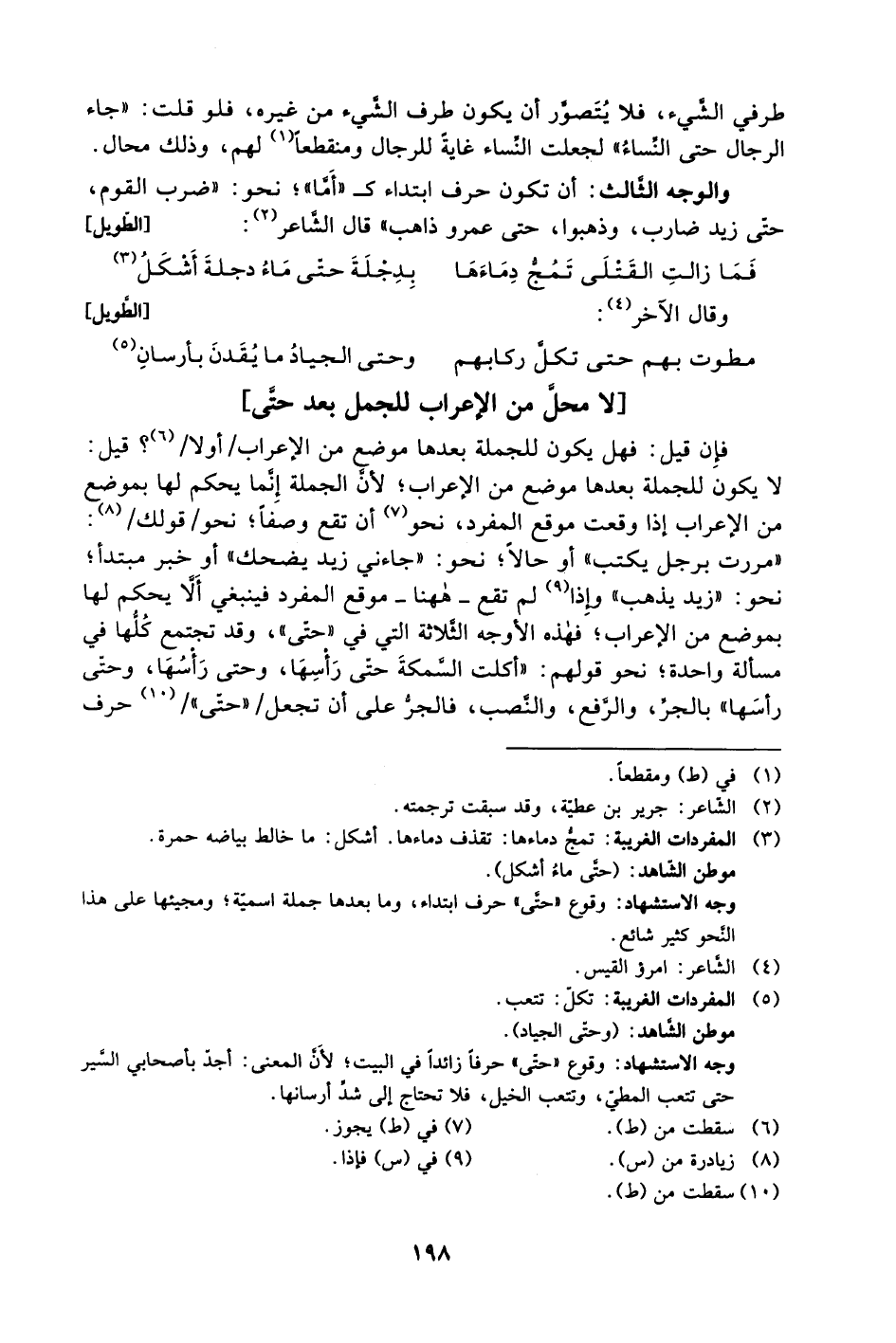 وجه الاستشهاد: وقوع "حتّى" حرفًا زائدًا في البيت؛ لأنَّ المعنى: أجد بأصحابي السَّير حتى تتعب المطي، وتتعب الخيل، فلا تحتاج إلى شدِّ أرسانها.