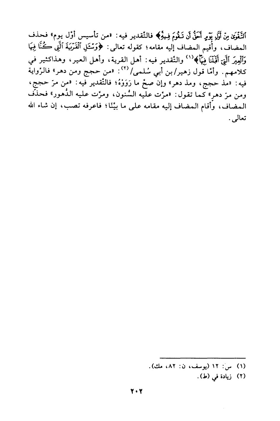 التَّقْوَى مِنْ أَوَّلِ يَوْمٍ أَحَقُّ أَنْ تَقُومَ فِيهِ} فالتقدير فيه: "مِن تأسيس أول يوم" فحذف المضاف، وأقيم المضاف إليه مقامه؛ كقوله تعالى: {وَاسْأَلِ الْقَرْيَةَ الَّتِي كُنَّا فِيهَا وَالْعِيرَ الَّتِي أَقْبَلْنَا فِيهَا} 1 والتقدير فيه: أهل القرية، وأهل العير، وهذا كثير في كلامهم. وأما قول زهير /بن أبي سُلمى/2: "مِن حجج ومِن دهر" فالرّواية فيه: "مذ حجج، ومذ دهر" وإن صحَّ ما رَوَوْهُ؛ فالتقدير فيه: "من مرّ حجج، ومن مرّ دهر" كما تقول: "مرت عليه السنون، ومرت عليه الدهور" فحذف المضاف، وأقام المضاف إليه مقامه على ما بينا؛ فاعرفه تصب، إن شاء الله تعالى.