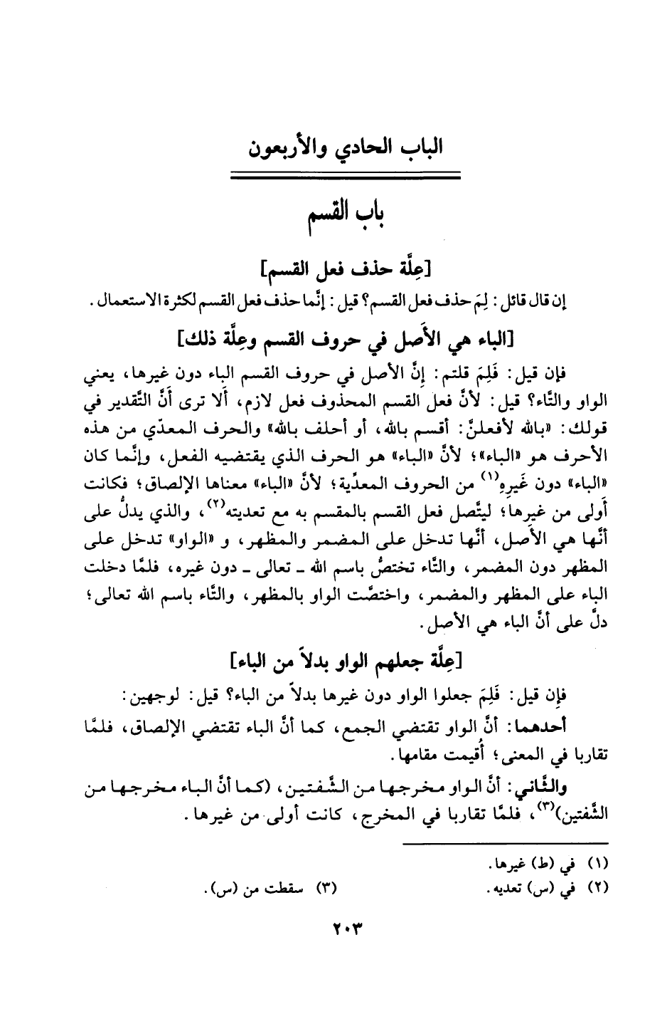 فإن قيل: فَلِمَ قلتم: إن الأصل في حروف القسم الباء دون غيرها، يعني الواو والتاء؟ قيل: لأن فعل القسم المحذوف فعل لازم، ألا ترى أن التقدير في قولك: "بالله لأفعلنَّ: أقسم بالله، أو أحلف بالله" والحرف المعدي من هذه الأحرف هو "الباء"؛ لأنَّ "الباء" هو الحرف الذي يقتضيه الفعل، وإنما كان "الباء" دون غيره1 من الحروف المعدِّية؛ لأنَّ "الباء" معناها الإلصاق؛ فكانت أولى من غيرها؛ ليتصل فعل القسم بالمقسم به مع تعديته2، والذي يدلُ على أنها هي الأصل، أنها تدخل على المضمر والمظهر، و"الواو" تدخل على المظهر دون المضمر، والتاء تختص باسم الله -تعالى- دون غيره، فلما دخلت "الباء" على المظهر والمضمر، واختصت الواو بالمظهر، والتاء باسم الله تعالى؛ دل على أن الباء هي الأصل.
