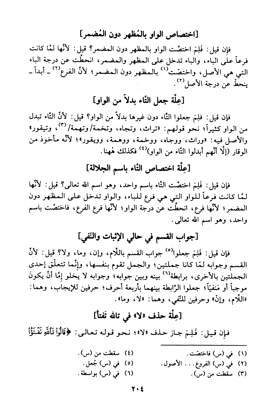 فإن قيل: فَلِمَ اختصت التاء باسم واحد، وهو اسم الله تعالى؟ قيل: لأنها لَمّا كانت فرعًا للواو والتي هي فرع للباء، والواو تدخل على المظهر دون المضمر؛ لأنها فرع انحطت عن درجة الواو، لأنها فرع الفرع، فاختصت باسم واحد، وهو اسم الله تعالى.