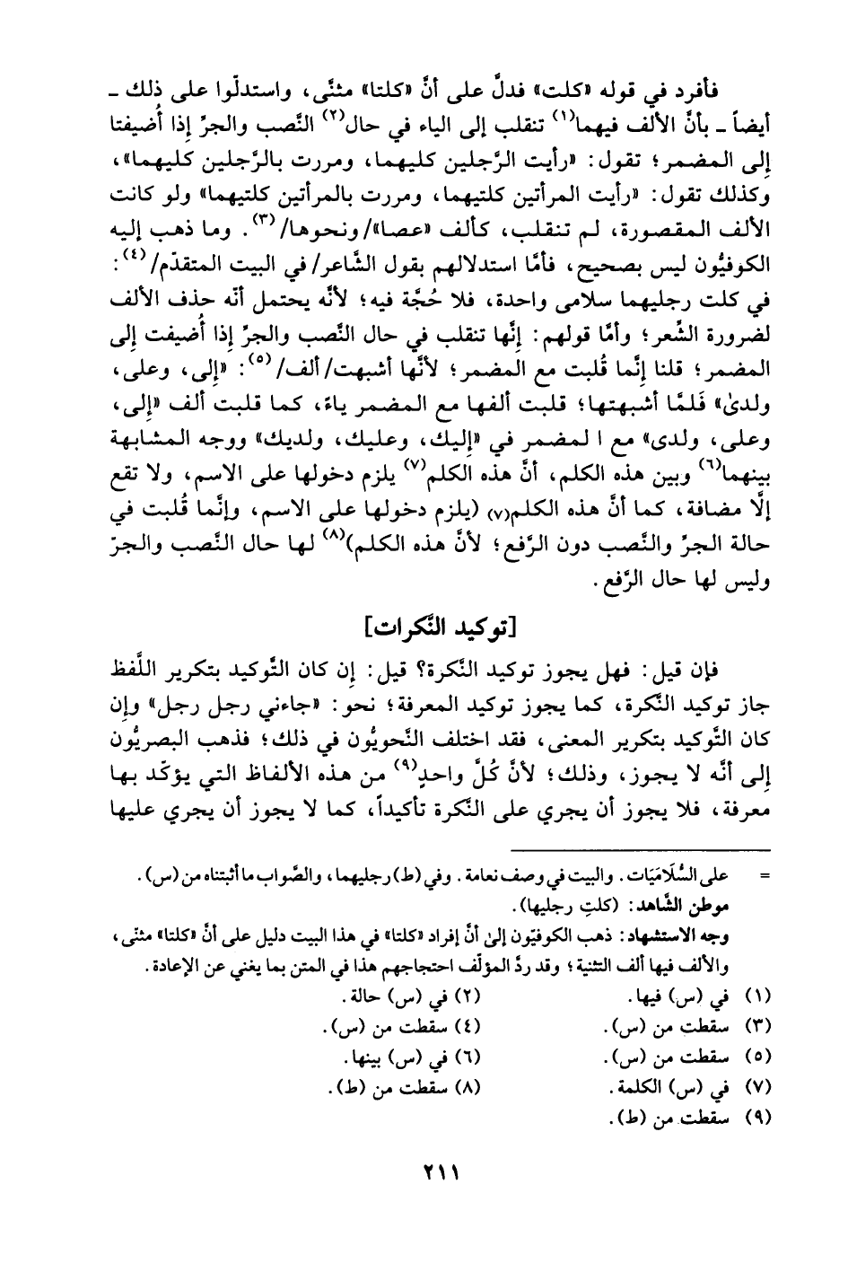 وجه الاستشهاد: ذهب الكوفيون إلى أن إفراد "كلتا" في هذا البيت دليل على أن "كلتا" مثنى، والألف فيها ألف التثنية؛ وقد ردَّ المؤلف احتجاجهم هذا في المتن بما يغني عن الإعادة.