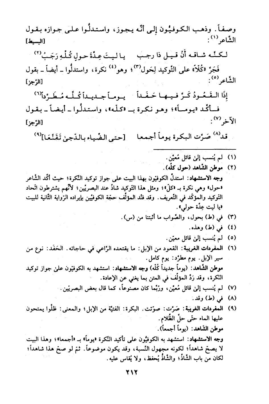 وجه الاستشهاد: استدلَّ الكوفيون بهذا البيت على جواز توكيد النكرة؛ حيث أكد الشاعر "حول" وهي نكرة بـ"كل"؛ ومثل هذا التوكيد شاذّ عند البصريين؛ لأنهم يشترطون اتحاد التوكيد والمؤكد في التعريف. وقد فند المؤلف حجة الكوفيين بإيراده الرواية الثانية للبيت "يا ليت عدة حولي".