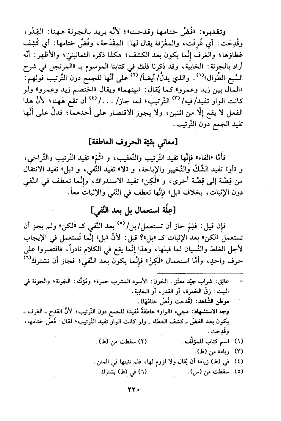 فأمَّا "الفاء" فإنها تفيد الترتيب والتعقيب، و"ثمّ" تفيد الترتيب والتراخي، و"أو" تفيد الشَّك والتخيير والإباحة، و"لا" تفيد النفي، و"بل" تفيد الانتقال من قصة إلى قصة أخرى، و"لكن" تفيد الاستدراك، وإنما تعطف في النفي دون الإثبات، بخلاف "بل" فإنها تعطف في النفي والإثبات معًا.