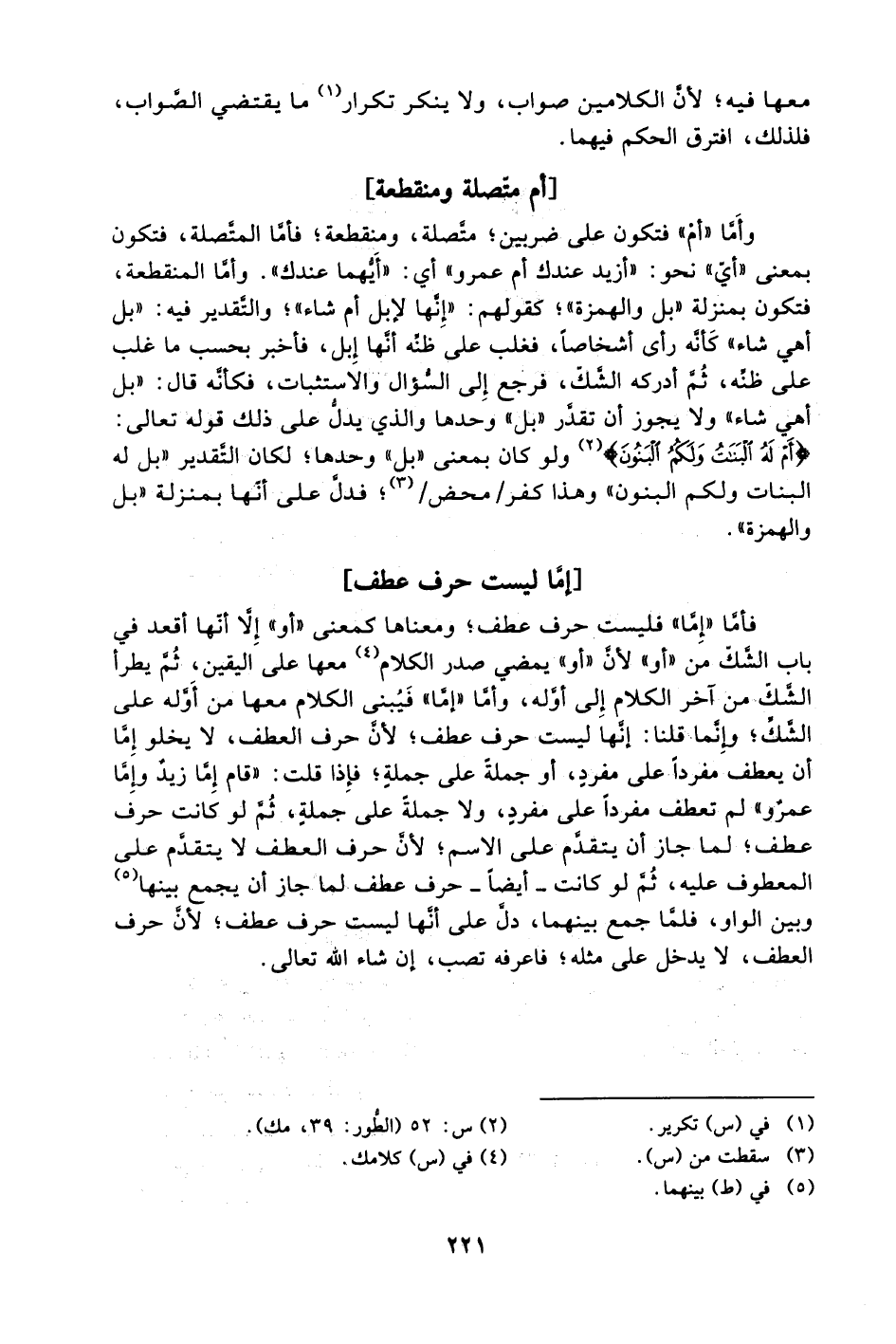 وأمَّا "أم" فتكون على ضربين؛ متصلة، ومنقطعة؛ فأمَّا المتصلة، فتكون بمعنى أي نحو: "أزيد عندك أم عمرو" أي: "أيهما عندك". وأمَّا المنقطعة، فتكون بمنزلة "بل والهمزة"؛ كقولهم: "إنها لإبل أم شاء"؛ والتقدير فيه: "بل أهي شاء" كأنه رأى أشخاصًا، فغلب على ظنه أنها إبل، فأخبر بحسب ما غلب على ظنِّه، ثم أدركه الشَّك، فرجع إلى السؤال والاستثبات، فكأنه قال: "بل أهي شاء" ولا يجوز أن تقدر "بل" وحدها والذي يدل على ذلك قوله تعالى: {أَمْ لَهُ الْبَنَاتُ وَلَكُمُ الْبَنُونَ} 2 ولو كان بمعنى "بل" وحدها؛ لكان التقدير بل له البنات ولكم البنون وهذا كفر /محض/3؛ فدل على أنها بمنزلة "بل والهمزة".