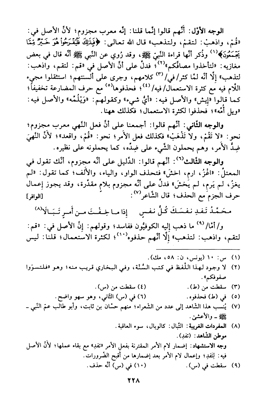 الوجه الأول: أنهم قالوا إنما قلنا: إنه معرب مجزوم؛ لأن الأصل في: "قُم، واذهب: لتقم، ولتذهب" قال الله تعالى: {فَبِذَلِكَ فَلْيَفْرَحُوا هُوَ خَيْرٌ مِمَّا يَجْمَعُونَ} 1 وذُكر أنَّها قراءة النبي -صلى الله عليه وسلم- وقد رُوي عن النبي -صلى الله عليه وسلم- أنه قال في بعض مغازيه: "لتأخذوا مصافَّكم"2؛ فدل على أن الأصل في "قم: لتقم، واذهب: لتذهب" إلا أنَّه لَمّا كثر /في/3 كلامهم، وجرى على ألسنتهم؛ استثقلوا مجيء اللام فيه مع كثرة الاستعمال /فيه/4؛ فحذفوها5 مع حرف المضارعة تخفيفًا؛ كما قالوا: "إِيش" والأصل فيه: "أي شيء" وكقولهم: "وَيْلُمِّه" والأصل فيه: "ويلُ أُمِّه"؛ فحذفوا لكثرة الاستعمال؛ فكذلك ههنا.