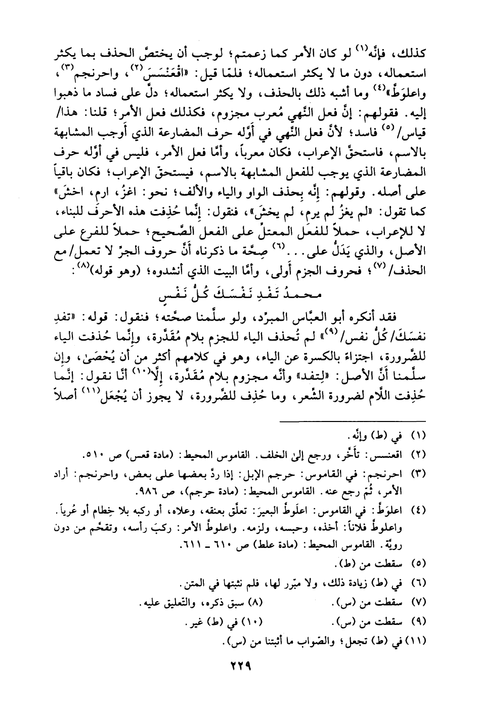 كذلك، فإنه1 لو كان الأمر كما زعمتم؛ لوجب أن يختصَّ الحذف بما يكثر استعماله، دون ما لا يكثر استعماله؛ فلمّا قيل: "اقعنسس2، واحرنجم3، واعلوَطَّ"4 وما أشبه ذلك بالحذف، ولا يكثر استعماله؛ دلَّ على فساد ما ذهبوا إليه. فقولهم: إنَّ فعل النهي مُعرب مجزوم، فكذلك فعل الأمر؛ قلنا: هذا /قياس/5 فاسد؛ لأنَّ فعل النهي في أوّله حرف المضارعة الذي أوجب المشابهة بالاسم، فاستحق الإعراب، فكان معربًا، وأما فعل الأمر، فليس في أوله حرف المضارعة الذي يوجب للفعل المشابهة بالاسم، فيستحق الإعراب؛ فكان باقيًّا على أصله. وقولهم: إنه بحذف الواو والياء والألف؛ نحو: "اغزُ، ارمِ، اخشَ" كما تقول: "لم يغزُ، لم يرمِ، لم يخشَ"، فنقول: إنما حُذفت هذه الأحرف للبناء، لا للإعراب، حملاً للفعل المعتل على الفعل الصحيح؛ حملاً للفرع على الأصل، والذي يدلُّ على..... 6 صحة ما ذكرناه أن حروف الجرِّ لا تعمل /مع الحذف/7؛ فحروف الجزم أولى، وأمَّا البيت الذي أنشدوه؛ وهو قوله8: