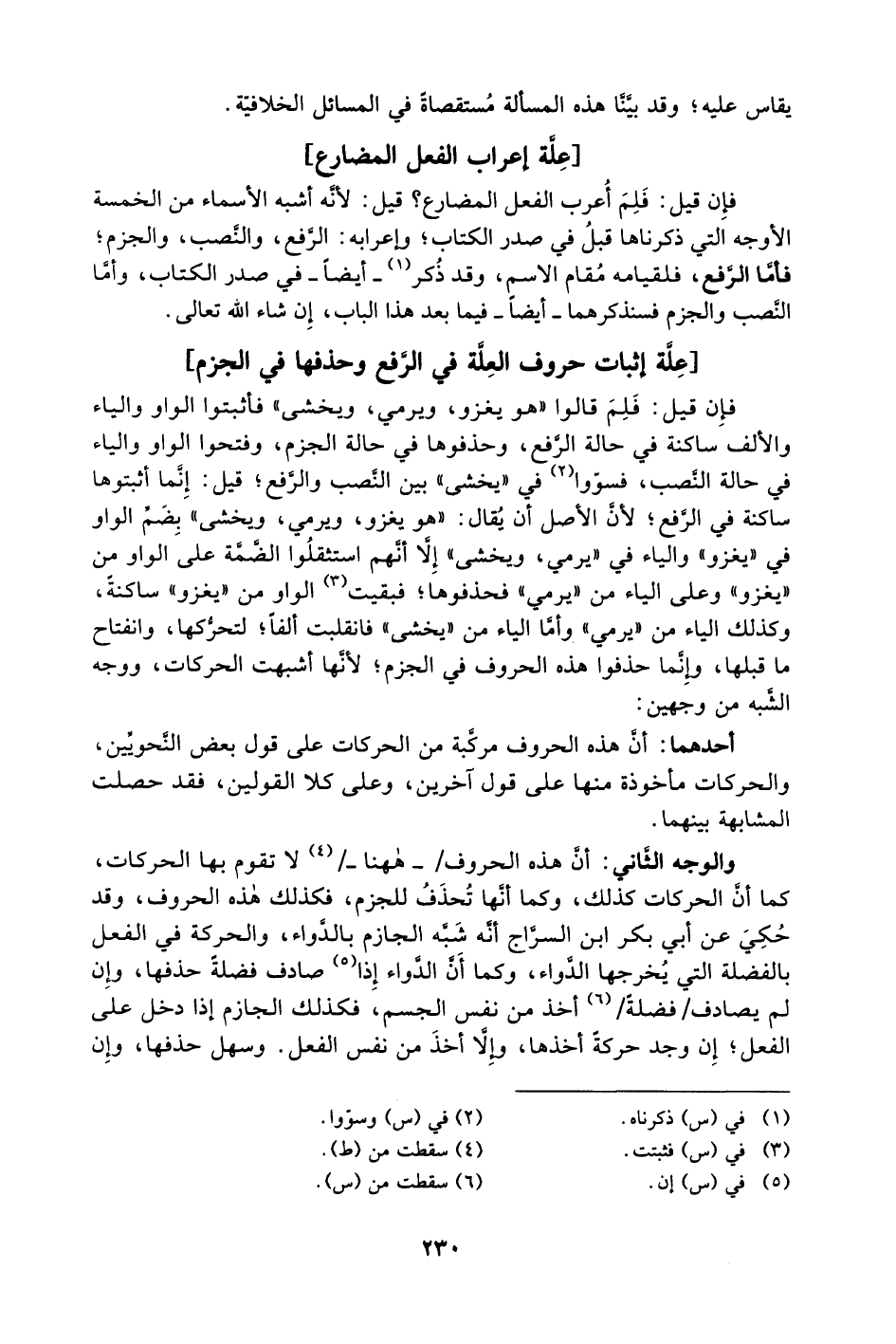 فإن قيل: فَلِمَ قالوا: "هو يغزو، ويرمي، ويخشى" فأثبتوا الواو والياء والألف ساكنة في حالة الرفع، وحذفوها في حالة الجزم، وفتحوا الواو والياء في حالة النصب، فسوّوا2 في يخشى بين النصب والرفع؛ قيل: إنَّما أثبتوها ساكنة في الرفع؛ لأن الأصل أن يُقال: "هو يغزو، ويرمي، ويخشى" بضَّمِّ الواو في "يغزو" والياء في "يرمي، ويخشى" لإلا أنهم استثقلوا الضمة على الواو من "يغزو" وعلى الياء من "يرمي" فحذفوها؛ فبقيت3 الواو من "يغزو" ساكنة، وكذلك الياء من "يخشى" فانقلبت ألفًا؛ لتحرُّكها، وانفتاح ما قبلها، وإنما حذفوا هذه الحروف في الجزم؛ لأنها أشبهت الحركات، ووجه الشبه من وجهين: