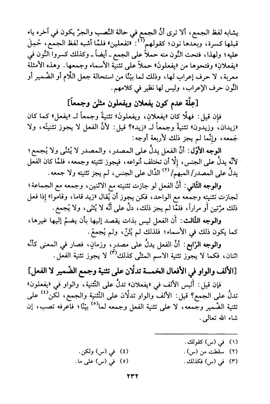 فإن قيل: فهلَّا كان "يفعلان، ويفعلون" تثنية وجمعًا لـ"يفعل" كما كان "زيدان، وزيدون" تثنية وجمعًا لـ"زيد"؟ قيل: لأن الفعل لا يجوز تثنيته، ولا جمعه، وإنما لم يجز ذلك لأربعة أوجه: