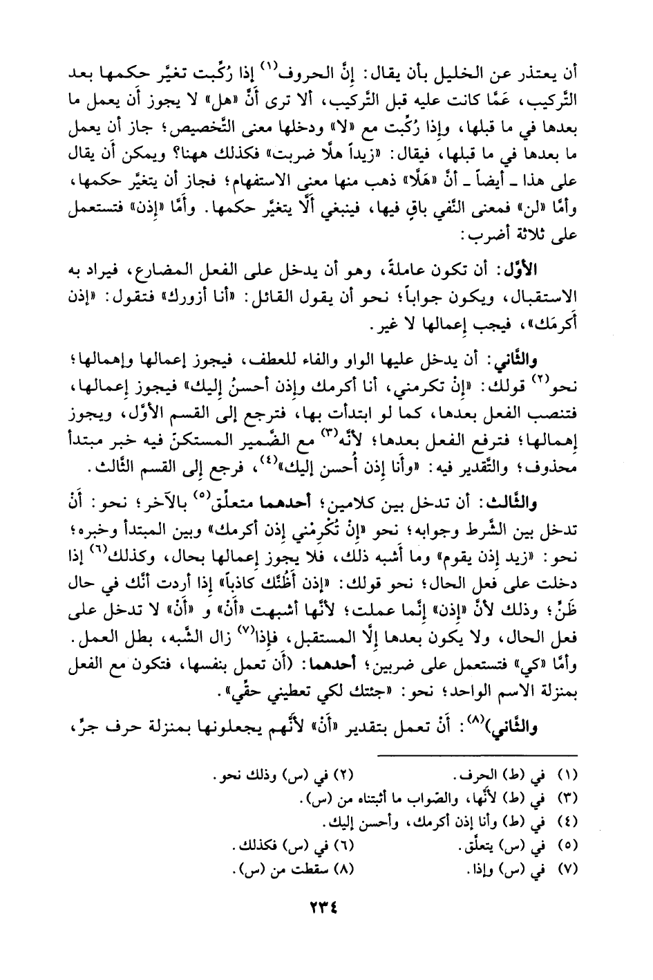 أن يعتذر عن الخليل بأن يقال: إنَّ الحروف1 إذا رُكِّبت تغيَّر حكمها بعد التَّركيب، عَمّا كانت عليه قبل التَّركيب، ألا ترى أنَّ "هل" لا يجوز أن يعمل ما بعدها في ما قبلها، وإذا رُكِّبت مع "لا" ودخلها معنى التخصيص؛ جاز أن يعمل ما بعدها في ما قبلها، فيقال: "زيدًا هلَّا ضربت" فكذلك ههنا؟ ويمكن أن يقال على هذا -أيضًا- أن "هلَّا" ذهب منها معنى الاستفهام؛ فجاز أن يتغير حكمها، وأما "لن" فمعنى النفي باقٍ فيها؛ فينبغي ألا يتغيَّر حكمها. وأما "إذن" فتستعمل على ثلاثة أضرب: