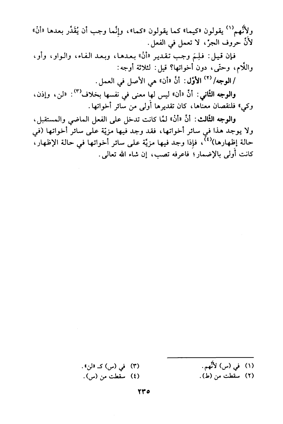 والوجه الثالث: أنَّ "أَنْ" لَمَّا كانت تدخل على الفعل الماضي والمستقبل، ولا يوجد هذا في سائر أخواتها، فقد وجد فيها مزيّة على سائر أخواتها (في حالة إظهارها) 4، فإذا وجد فيها مزيَّة على سائر أخواتها في حالة الإظهار، كانت أولى بالإضمار؛ فاعرفه تصب، إن شاء الله تعالى.