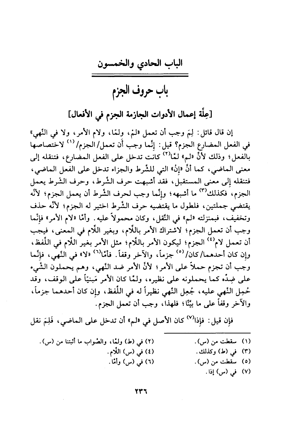 إن قال قائل: لِمَ وجب أن تعمل "لَمْ، ولَمّا، ولام الأمر، ولا في النَّهي" في الفعل المضارع الجزم؟ قيل: إنَّما وجب أن تعمل /الجزم/1 لاختصاصها بالفعل؛ وذلك لأن "لَمْ" لَمَّا2 كانت تدخل على الفعل المضارع، فتنقله إلى معنى الماضي، كما أنَّ "إِنْ" التي للشرط والجزاء تدخل على الفعل الماضي، فتنقله إلى معنى المستقبل، فقد أشبهت حرف الشرط، وحرف الشرط يعمل الجزم، فكذلك3 ما أشبهه؛ وإنَّما وجب لحرف الشرط أن يعمل الجزم؛ لأنَّه يقتضي جملتين، فلطول ما يقتضيه حرف الشرط اختير له الجزم؛ لأنَّه حذف وتخفيف، فبمنزلته "لَمْ" في النقل، وكان محمولاً عليه. وأما "لام الأمر" فإنما وجب أن تعمل الجزم؛ لاشتراك الأمر باللام، وبغير اللام في المعنى، فيجب أن تعمل لام4 الجزم؛ ليكون الأمر باللام؛ مثل الأمر بغير اللام في اللفظ، وإن كان أحدهما /كان/5 جزمًا، والآخر وفقًا. فأمَّا6 "لا" في النهي، فإنما وجب أن تجزم حملاً على الأمر؛ لأن الأمر ضد النهي، وهم يحملون الشيء على ضده كما يحملونه على نظيره، ولَمَّا كان الأمر مبنيًّا على الوقف، وقد حُمِل النهي عليه، جُعل النهي نظيرًا له في اللفظ، وإن كان أحدهما جزمًا، والآخر وقفًا على ما بينا؛ فلهذا، وجب أن تعمل الجزم.