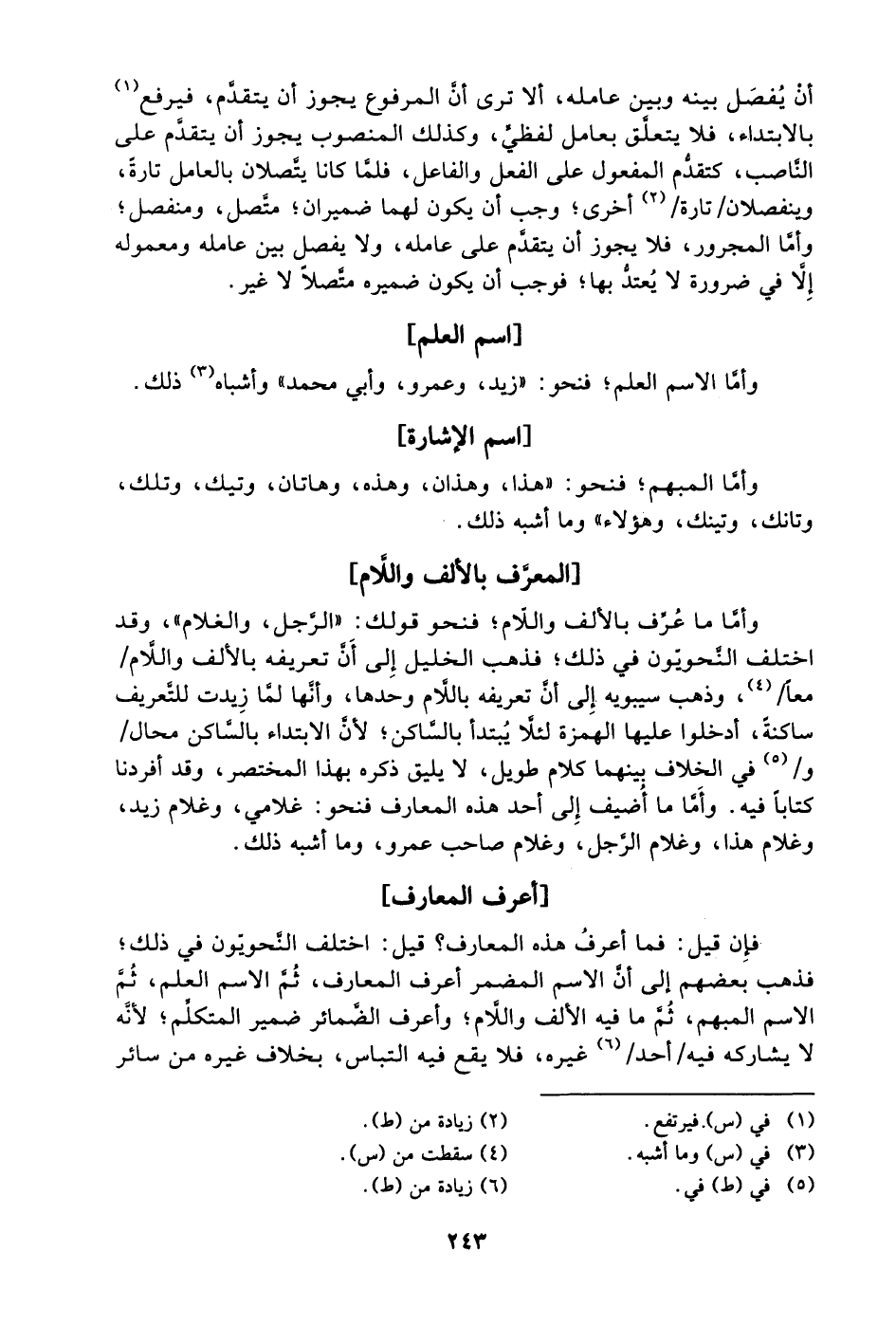 وأمَّا ما عُرِّف بالألف واللام؛ فنحو قولك: "الرجل، والغلام"، وقد اختلف النحويون في ذلك؛ فذهب الخليل إلى أنَّ تعريفه بالألف واللام /معًا/4، وذهب سيبويه إلى أن تعريفه باللام وحدها، وأنها لَمَّا زيدت للتعريف ساكنةً، أدخلوا عليها الهمزة لئلا يُبتدأ بالساكن؛ لأن الابتداء بالساكن محال /و/5 في الخلاف بينهما كلام طويل، لا يليق ذكره بهذا المختصر، وقد أفردنا كتابًا فيه. وأمَّا ما أضيف إلى أحد هذه المعارف فنحو: غلامي، وغلام زيد، وغلام هذا، وغلام الرجل، وغلام صاحب عمرو، وما أشبه ذلك.