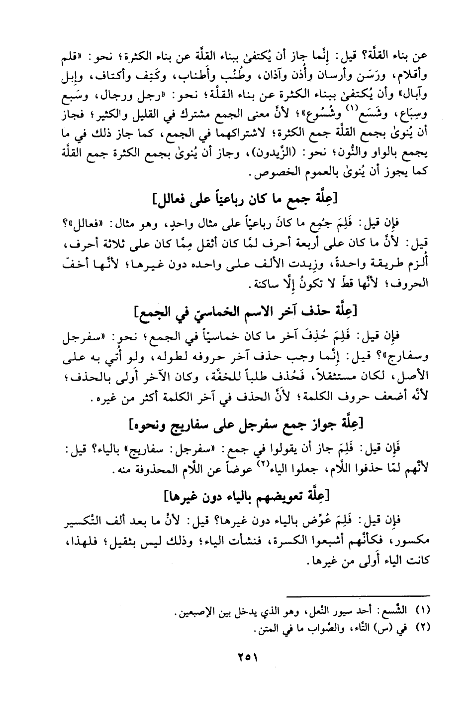 فإن قيل: فَلِمَ حُذف آخر ما كان خمسيًّا في الجمع؛ نحو: "سفرجل وسفارج"؟ قيل: إنما وجب حذف آخر حروفه لطوله، ولو أتي به على الأصل، لكان مستثقلاً، فحُذف طلبًا للخفة، وكان الآخر أولى بالحذف؛ لأنَّه أضعف حروف الكلمة؛ لأنَّ الحذف في آخر الكلمة أكثر من غيره.