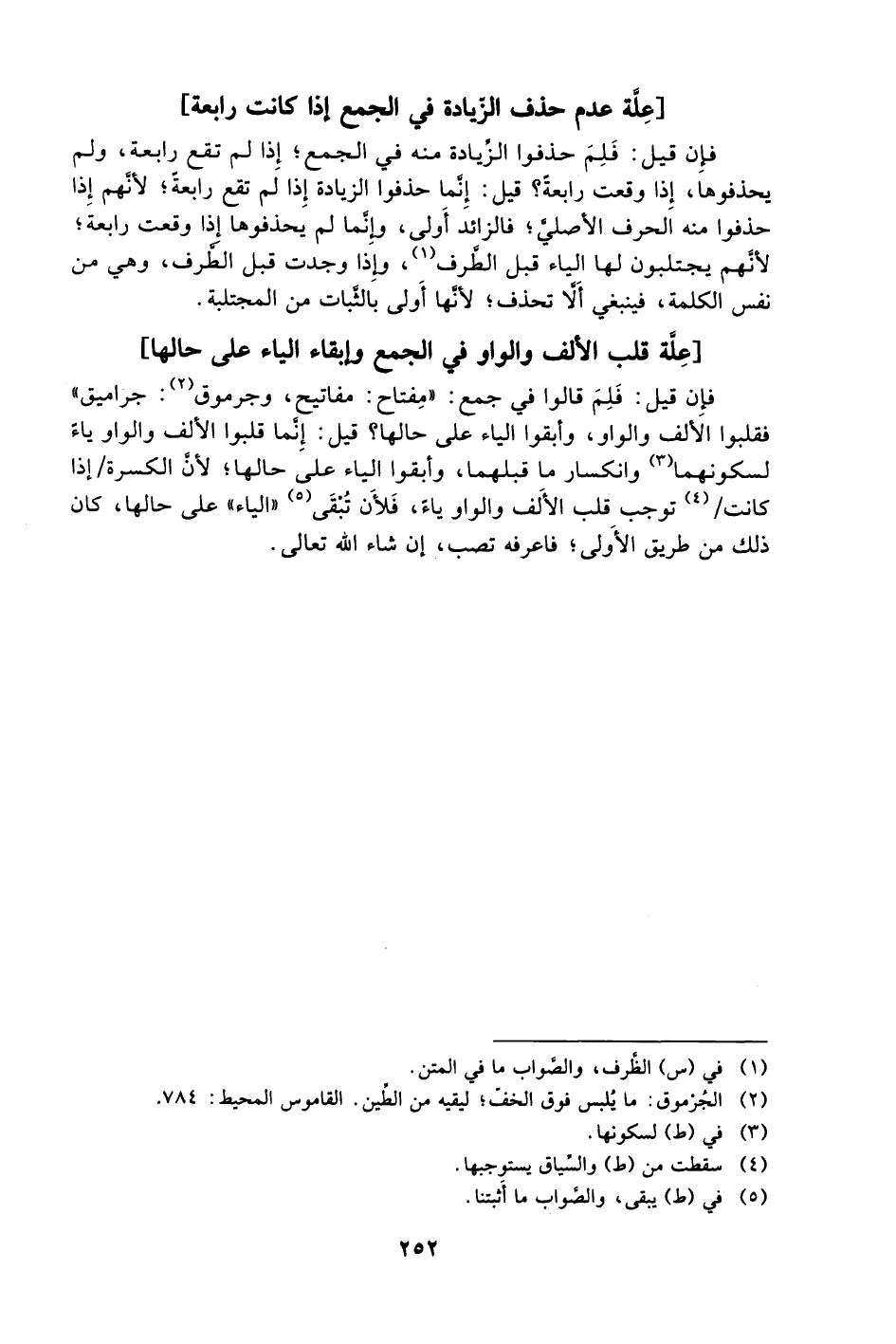 فإن قيل: فَلِمَ قالوا جمع: "مفتاح: مفاتيح، وجرموق2: جراميق" فقلبوا الألف والواو، وأبقوا الياء على حالها؟ قيل: إِنَّما قلبوا الألف والواو ياء لسكونهما3 وانكسار ما قبلهما، وأبقوا الياء على حالها؛ لأنَّ الكسرة /إذا كانت/4 توجب قلب الألف والواو ياء، فَلأَن تُبْقَى5 "الياء" على حالها، كان ذلك من طريق الأولى؛ فاعرفه تصب، إن شاء الله تعالى.