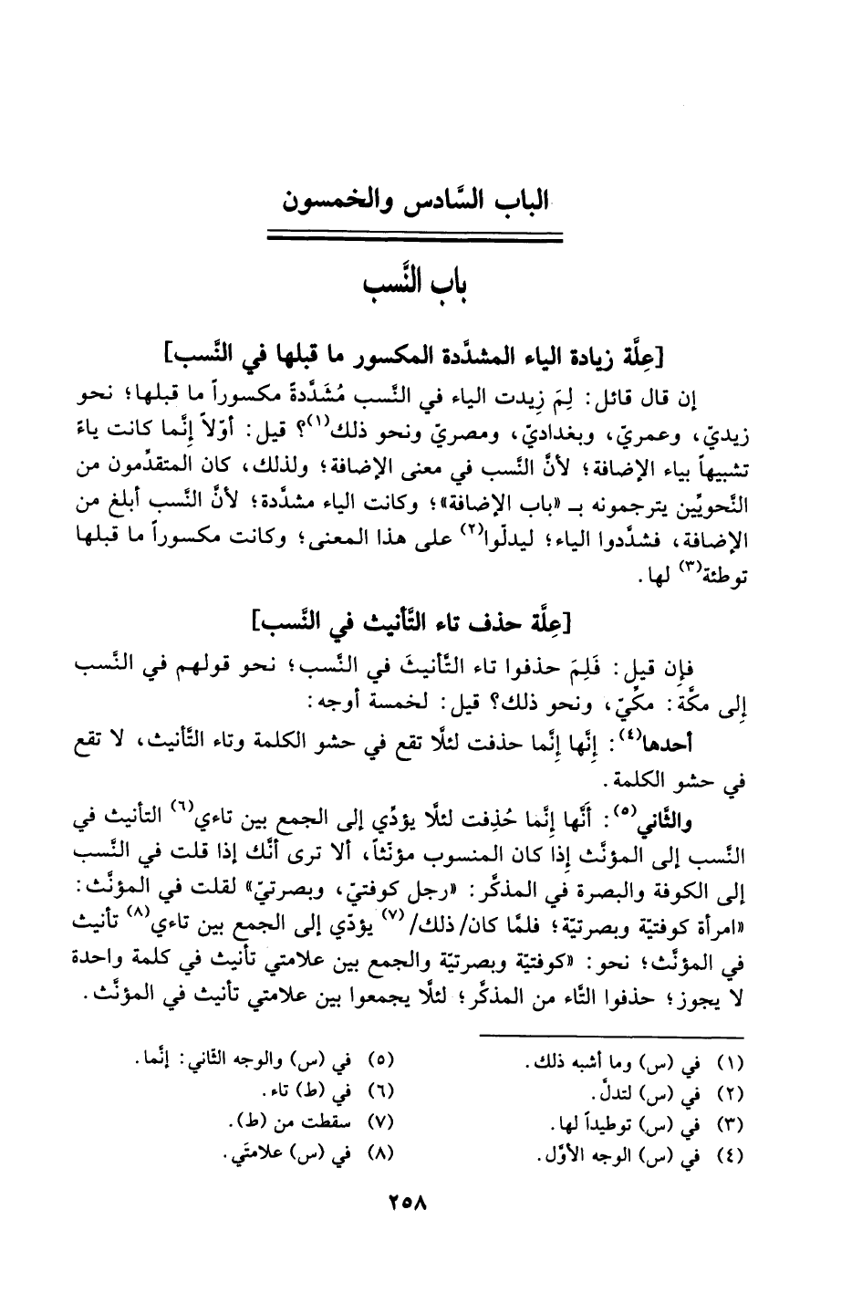 فإن قيل: فَلِمَ حذفوا تاء التأنيث في النسب؛ نحو قولهم في النسب إلى مكة: مكِّيّ، ونحو ذلك؟ قيل: لخمسة أوجه: