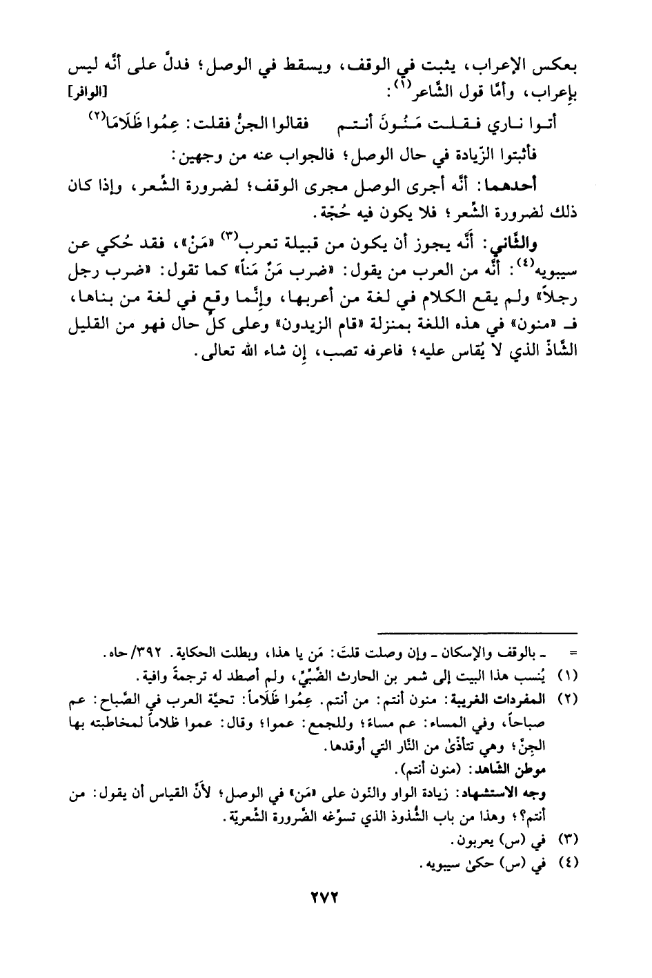 والثاني: أنه يجوز أن يكون من قبيلة تعرب3 "مَنْ"، فقد حُكي عن سيبويه4: أنَّه من العرب من يقول: "ضرب مَنٌ مَنًا" كما تقول: "ضرب رجل رجلاً" ولم يقع الكلام في لغة من أعربها، وإِنَّما وقع في لغة من بناها، فـ"منون" في هذه اللغة بمنزلة "قام الزيدون" وعلى كل حال فهو من القليل الشاذ الذي لا يُقاس عليه؛ فاعرفه تصب، إن شاء الله تعالى.
