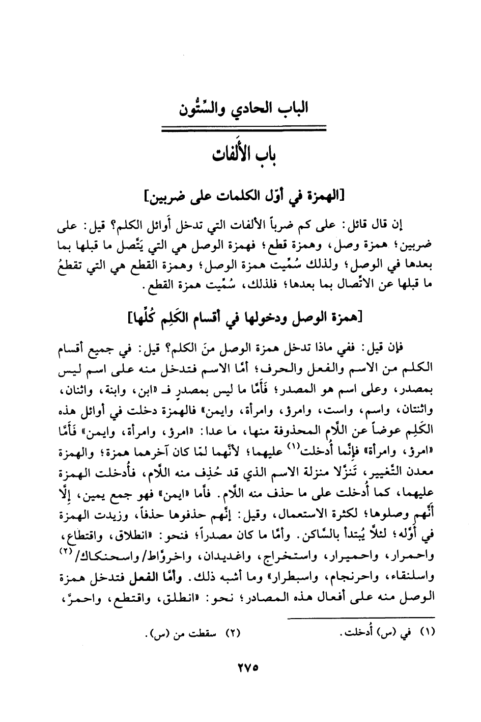 إن قال قائل: على كم ضربًا الألفات التي تدخل أوائل الكلم؟ قيل: على ضربين؛ همزة وصل، وهمزة قطع؛ فهمزة الوصل هي التي يتَّصل ما قبلها بما بعدها في الوصل؛ ولذلك سُمِّيت همزة الوصل؛ وهمزة القطع هي التي تقطعُ ما قبلها عن الاتصال بما بعدها؛ فلذلك، سُمِّيت همزة القطع.