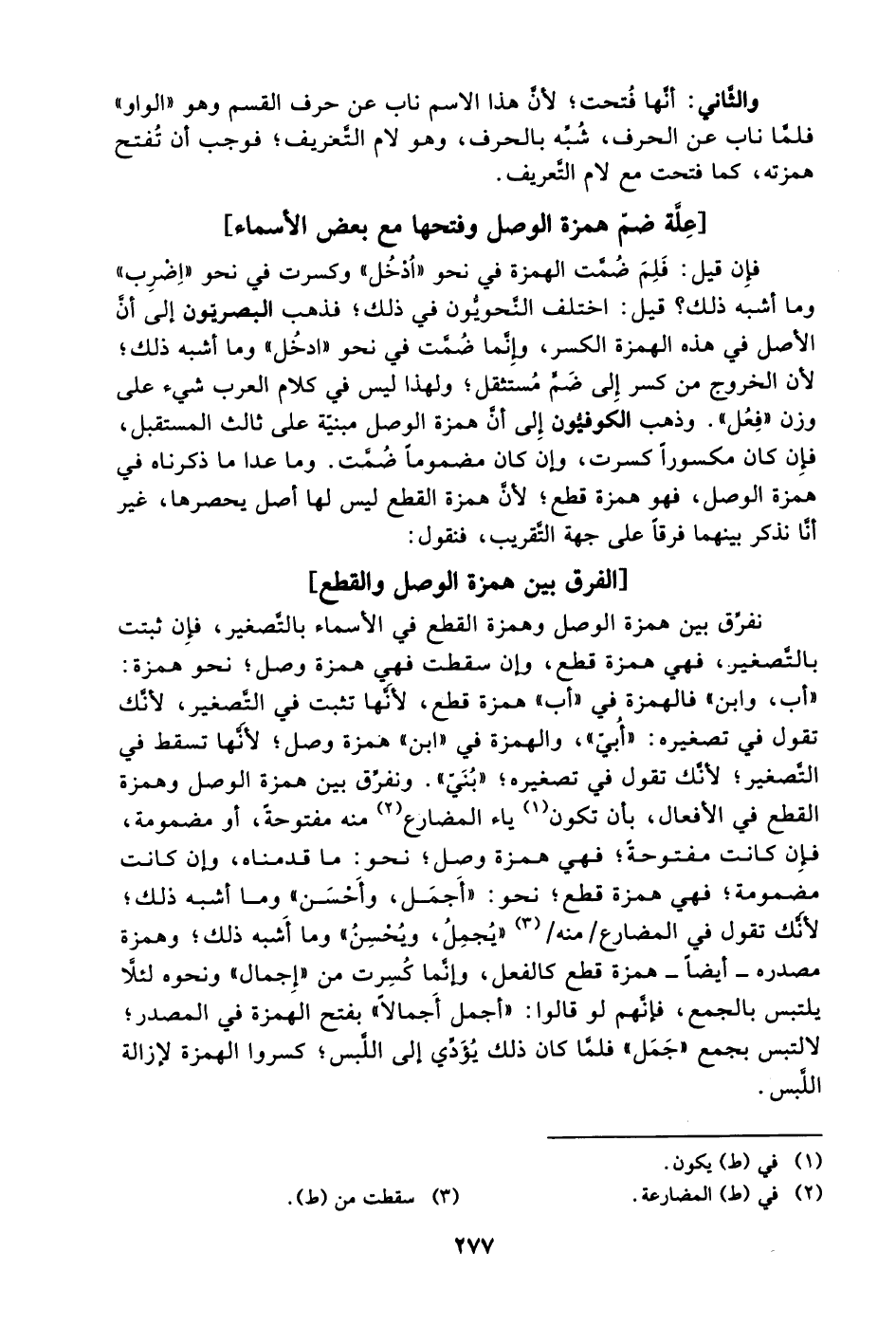 فإن قيل: فَلِمَ ضمت الهمزة في نحو "اُدْخُل" وكسرت في نحو "اِضْرِب" وما أشبه ذلك؟ قيل: اختلف النحويون في ذلك؛ فذهب البصريون إلى أن الأصل في هذه الهمزة الكسر، وإنما ضُمت في نحو "ادخُل" وما أشبه ذلك؛ لأنَّ الخروج من كسر إلى ضم مُستثقل؛ ولهذا ليس في كلام العرب شيء على وزن "فِعُل". وذهب الكوفيون إلى أن همزة الوصل مبنية على ثالث المستقبل، فإن كان مكسورًا كسرت، وإن كان مضمومًا ضُمَّت. وما عدا ما ذكرناه في همزة الوصل، فهو همزة قطع؛ لأنَّ همزة القطع ليس لها أصل يحصرها، غير أنَّا نذكر بينهما فرقًا على جهة التقريب، فنقول: