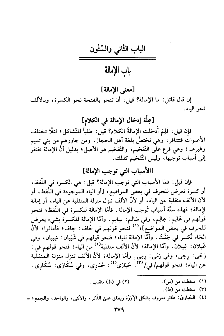 فإن قيل: فما الأسباب التي توجب الإمالة؟ قيل: هي الكسرة في اللفظ، أو كسرة تعرض للحرف في بعض المواضع، (أو الياء الموجودة في اللفظ، أو لأنَّ الألف منقلبة عن الياء، أو لأنَّ الألف تنزل منزلة المنقلبة عن الياء، أو إمالة لإمالة؛ فهذه ستة أسباب تُوجب الإمالة. فأمَّا الإمالة للكسرة في اللفظ؛ فنحو قولهم في عَالِم: عِالِم، وفي سَالِم: سِالِم. وأمَّا الإمالة للكسرة بشيء يعرض للحرف في بعض المواضع) ؛1 فنحو قولهم في خَاف: خِاف؛ فأمالوا؛ لأنَّ الخاء تُكسر في خِفْتُ. وأمَّا الإمالة للياء؛ فنحو قولهم في شَيْبَان: شِيبان، وفي غَيلان: غِيلان. وأمَّا الإمالة؛ لأنَّ الألف منقلبة2 من الياء؛ فنحو قولهم في: رَحَى: رِحِى، وفي رَمَى: رِمِى. وأمَّا الإمالة؛ لأن الألف تنزل منزلة المنقلبة عن الياء؛ فنحو قولهم /في/3: حُبَارَى4: حُبَارِى، وفي سُكارَى: سُكَارِى.