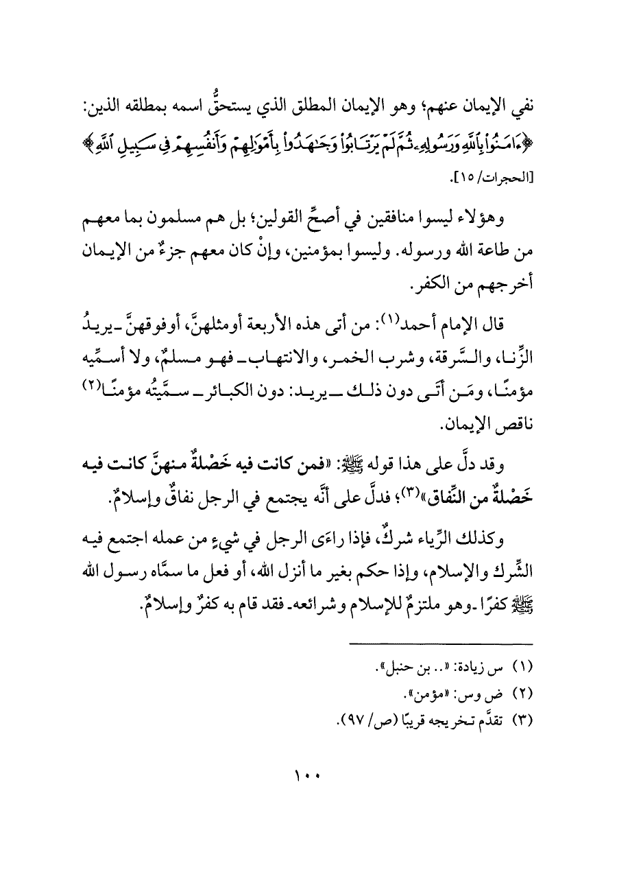 قال الإمام أحمد (¬١): من أتى هذه الأربعة أومثلهنَّ، أوفوقهنَّ ـ يريدُ الزِّنا، والسَّرقة، وشرب الخمر، والانتهاب ـ فهو مسلمٌ، ولا أسمِّيه مؤمنًا، ومَن أتَى دون ذلك ــ يريد: دون الكبائر ـ سمَّيتُه مؤمنًا (¬٢) ناقص الإيمان.