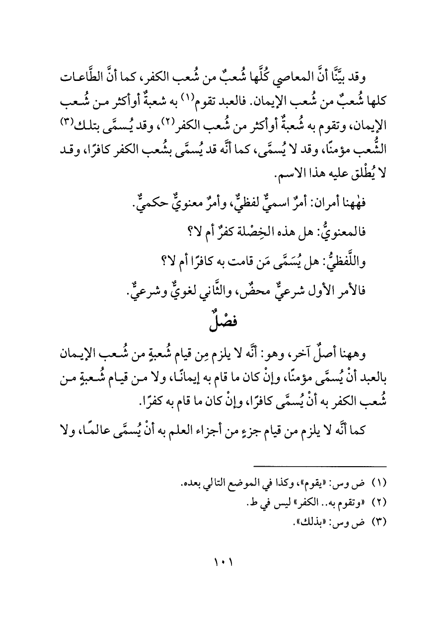 وههنا أصلٌ آخر، وهو: أنَّه لا يلزم مِن قيام شُعبةٍ من شُعب الإيمان بالعبد أنْ يُسمَّى مؤمنًا، وإنْ كان ما قام به إيمانًا، ولا من قيام شُعبةٍ من شُعب الكفر به أنْ يُسمَّى كافرًا، وإنْ كان ما قام به كفرًا.
